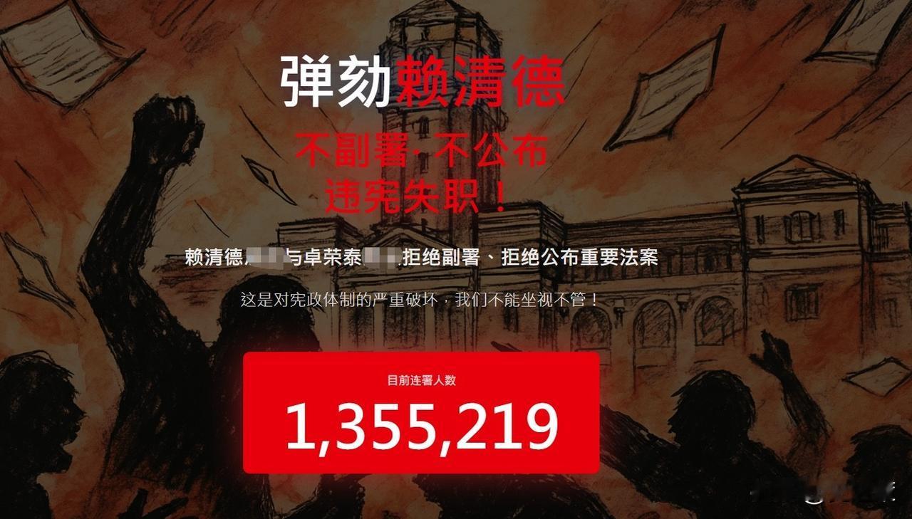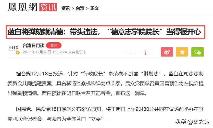 12月18日,岛内舆论炸锅,蓝白将联手弹劾,下架赖清德,目前已超130万人连署 不简单啊,蓝白这是彻底掀桌子了。根据凤凰卫视咨询台的报道,台湾国民党与民众党“立委”12月18日在司法法制委员会上,提出临时提案,准备弹劾台 “行政院长”卓荣泰。同时,蓝白双方还预告会在19号宣布弹劾赖清德的消息。 目前,根据蓝、白发布的采访通知,双方将会在19日的上午9点30分,在议场前举办一场名为「弹劾违宪xx,反帝制、反专制、反独裁」在野党团联合记者会,会上将宣布弹劾赖清德的消息。届时,全体蓝白立委都将出席会议。 之所以闹这么大,是因为蓝白刚刚在台湾立法机构联手推动了一项名为“财政收支划分法”修正案,核心就是调整地方与当局财政分配等相关事宜。很明显,这项修正案和赖清德的路线明显不对付。 因此,赖清德一开始授意卓荣泰提出复议。随后,复议被蓝白“掌握”的立法机构否决。而根据岛内的相关规定,复议被否决后,行政机构必须接受决议并副署(签字确认)。然而,就在12月15日,卓荣泰表态不愿意副署,赖清德也宣称“不公布”。 而只要卓荣泰不副署,即使“法案”通过也没有用。所以,在今天(18号)的会议上,蓝白“立委”联手通过了临时提案,准备弹劾卓荣泰。 除此之外,黄国昌还指出,他们将会在院会正式对赖清德提出弹劾案。届时,依据岛内的相关规定,赖清德需要列席说明。在宣布该消息的时候,民众党还狠狠地批评了赖清德,说赖清德的「德意志学院院长」当的很开心,除了发明古今中外从未听闻、一连串违背民主常识且贻笑大方的政治名词外,更变本加厉,带头违法指挥行政体系,带头“毁宪乱政”。 实际上,卓荣泰之所以不愿意副署,还不是得到了赖清德的授意。不过话说回来,弹劾赖清德和卓荣泰可不容易,需要很高的门槛。其中,必须要满足的一条就是三分之二的“立委”同意。可就算是蓝白加在一起,人数也只不过是刚刚超过了二分之一,根本达不到弹劾的门槛。 当然 这并不代表没有任何意义,最起码能引起民众的共鸣,为2026年的中期选举,乃至是2028年的大选铺路。而根据岛内最新消息,截止到12月18日晚22点左右,已经有超过135万人连署支持弹劾赖清德。目前,人数还在进一步增加当中。