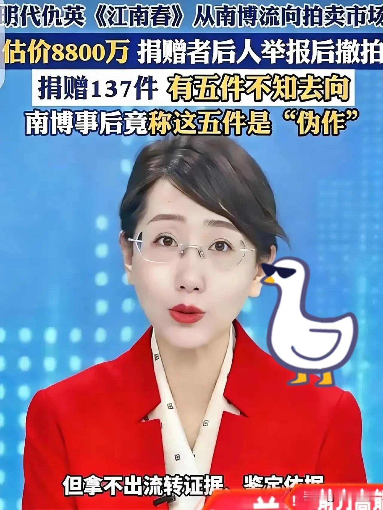 南京博物馆这次尴尬了。估价8800万元的捐赠古画准备拍卖,被捐赠人发现了,一查才知道,自家捐赠给南京博物馆其它的4件文物也都不见了。南京博物馆估计怎么都想不到,已经过了60多年,捐赠者后人还记得。更想不到,人家庞家还留着60多年前的捐赠票据。 得先掰扯清楚,这事里的是南京博物院,不是南京博物馆,一字之差,差得不少。 庞家祖上是近现代顶尖的收藏大家,家里的“虚斋”藏画,当年有江南收藏甲天下的名头。 六十多年前的开春,庞家后人把一百多幅压箱底的古画,捐给了南京博物院。 省里特意给庞家发了奖状,庞家人把捐赠的票据、清册,仔细收了大半辈子。 今年年中,庞家后人庞叔令,撞见自家捐的仇英《江南春》图卷,出现在北京的拍卖预展。 那幅画的估价是8800万,她当场举报,没多久这幅拍品就被撤了。 没过俩月,她按着法院的约定,去南博查当年的捐赠文物。 找来找去,当初捐的那些画里,整整五幅没了踪影。 这五幅里有《江南春》,还有另外四幅明清时期的古画。 南博的回应是,这五幅早年被鉴定为伪作,九十年代按规定做了处置。 但按文物管理的规矩,处置捐赠文物,得先告知捐赠方,还要留全记录。 这些该有的流程,南博一样都没做到,也拿不出文物的流转踪迹。 这阵子,江苏省文旅厅已经成立专班调查,国家文物局也在核实情况。 这事最戳人的从来不是画值多少钱,是当年交出家底的那份信任,被轻慢了。 各位读者你们怎么看?欢迎在评论区讨论。 南京国家文物