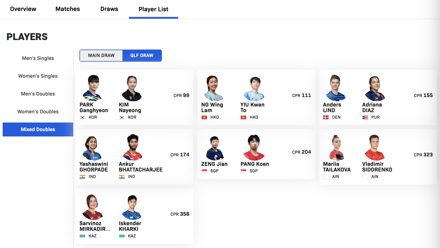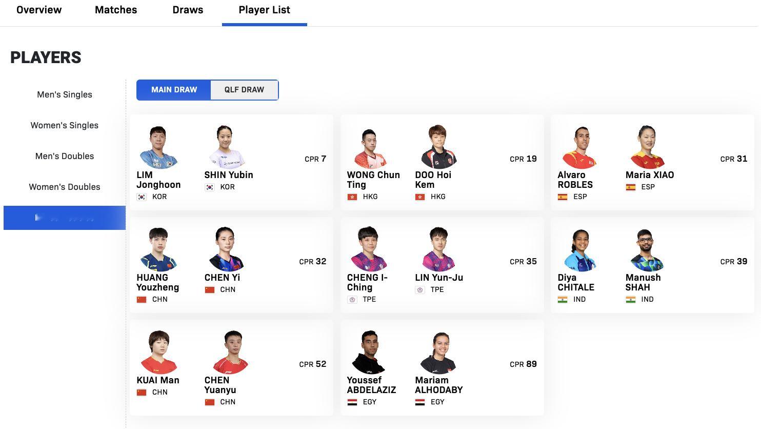 WTT球星挑战赛多哈站1.13-1.18丨混双外协参赛名单【正赛】林钟勋/申裕斌🇰🇷、黄镇廷/杜凯琹🇭🇰、罗伯勒斯/肖瑶茜🇪🇸、林昀儒/郑怡静(中国台北)、玛纳什·沙/奇塔莱🇮🇳、阿齐兹/阿尔霍达比🇪🇬【资格赛】朴康贤/金娜英🇰🇷、姚钧涛/吴咏琳🇭🇰、林德🇩🇰/迪亚兹🇵🇷、巴特查尔吉/格尔帕德🇮🇳、冯耀恩/曾尖🇸🇬、希德仁科/泰拉科娃(AIN)、哈吉/米尔卡迪罗娃🇰🇿