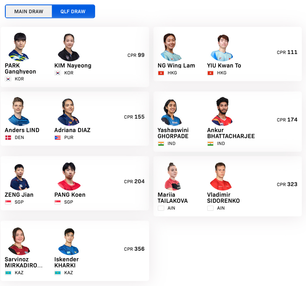 WTT球星挑战赛多哈站2026【混双参赛名单】比赛时间:1.13-1.18正赛:林钟勋/申裕斌🇰🇷,黄镇廷/杜凯琹🇭🇰,罗布勒斯/肖瑶茜🇪🇸,黄友政/陈熠🇨🇳,郑怡静/林昀儒(中国台北),奇塔莱/沙🇮🇳,蒯曼/陈垣宇🇨🇳,阿卜杜拉阿齐兹/阿尔霍达比🇪🇬资格赛:朴康贤/金娜英🇰🇷,吴咏琳/姚钧涛🇭🇰,林德🇩🇰/迪亚兹🇵🇷,戈尔帕德/巴塔查尔吉🇮🇳,曾尖/冯耀恩🇸🇬,泰拉科娃/西多仁科AIN,米尔卡迪洛娃/卡尔基🇰🇿