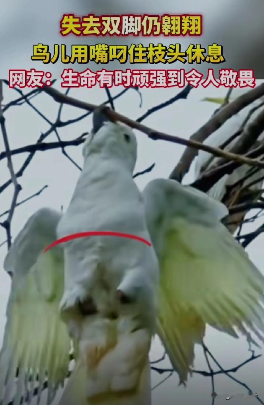 一只失去双脚的鸟, 用嘴叨着树枝休息, 让人感叹生命有时候就是这么顽强, 就是不知道它腿是怎么失去的?
