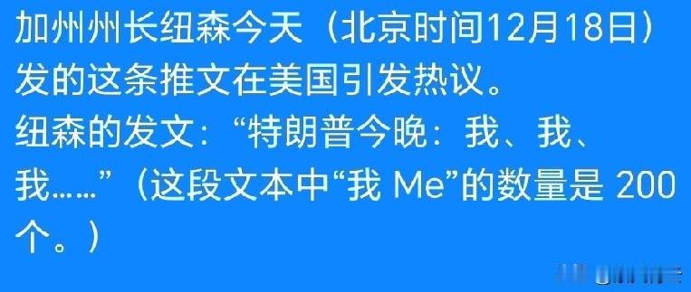 谁能想到美国政坛还能这么玩?加州州长纽森一条推文直接引爆全网,连着刷了200遍类似“我”的表述,明眼人一看就知道是在调侃特朗普。明明没带一个脏字,却把调侃拉满。 要知道这俩人早就针尖对麦芒,从移民政策到国民警卫队调动,联邦和加州的权争就没停过。纽森这波操作特别聪明,他之前就总模仿特朗普的社交媒体风格,用夸张表达吸睛,现在更是精准吐槽对方说话总围着自己转。 不过这招确实绝[赞],把特朗普的特点扒得明明白白!