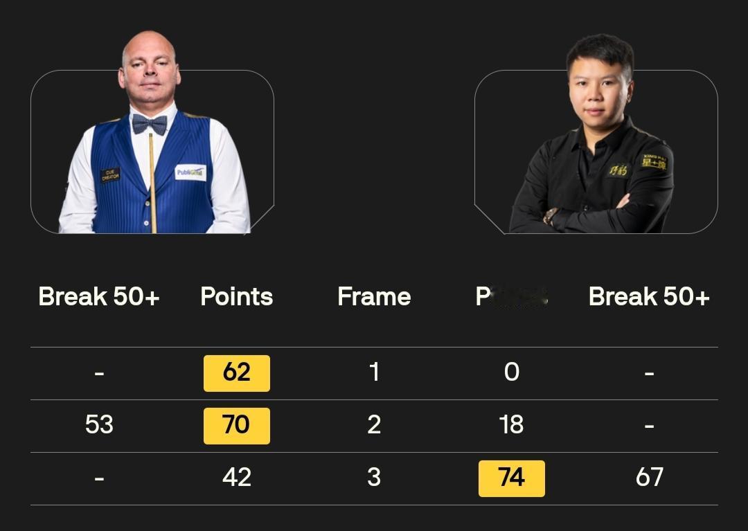 周跃龙 2-2 斯图尔特·宾汉姆 12月19日,斯诺克苏格兰公开赛16进8轮次,周跃龙对阵斯图尔特·宾汉姆。此前两人交手8次,周跃龙获胜四次。 比赛开始,宾汉姆迅速进入状态,连赢两局,2-0领先!周跃龙沉着应战,打出单杆67分、100分,连扳两局,追平比分。 本场比赛的胜者,8进4轮次对阵克里斯·韦克林,后者4-2击败袁思俊晋级8强。