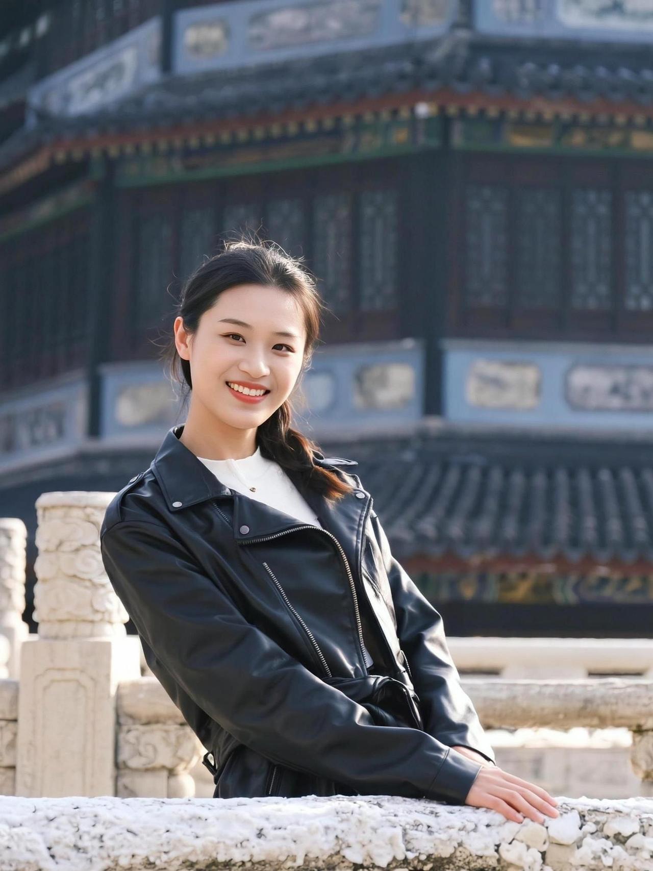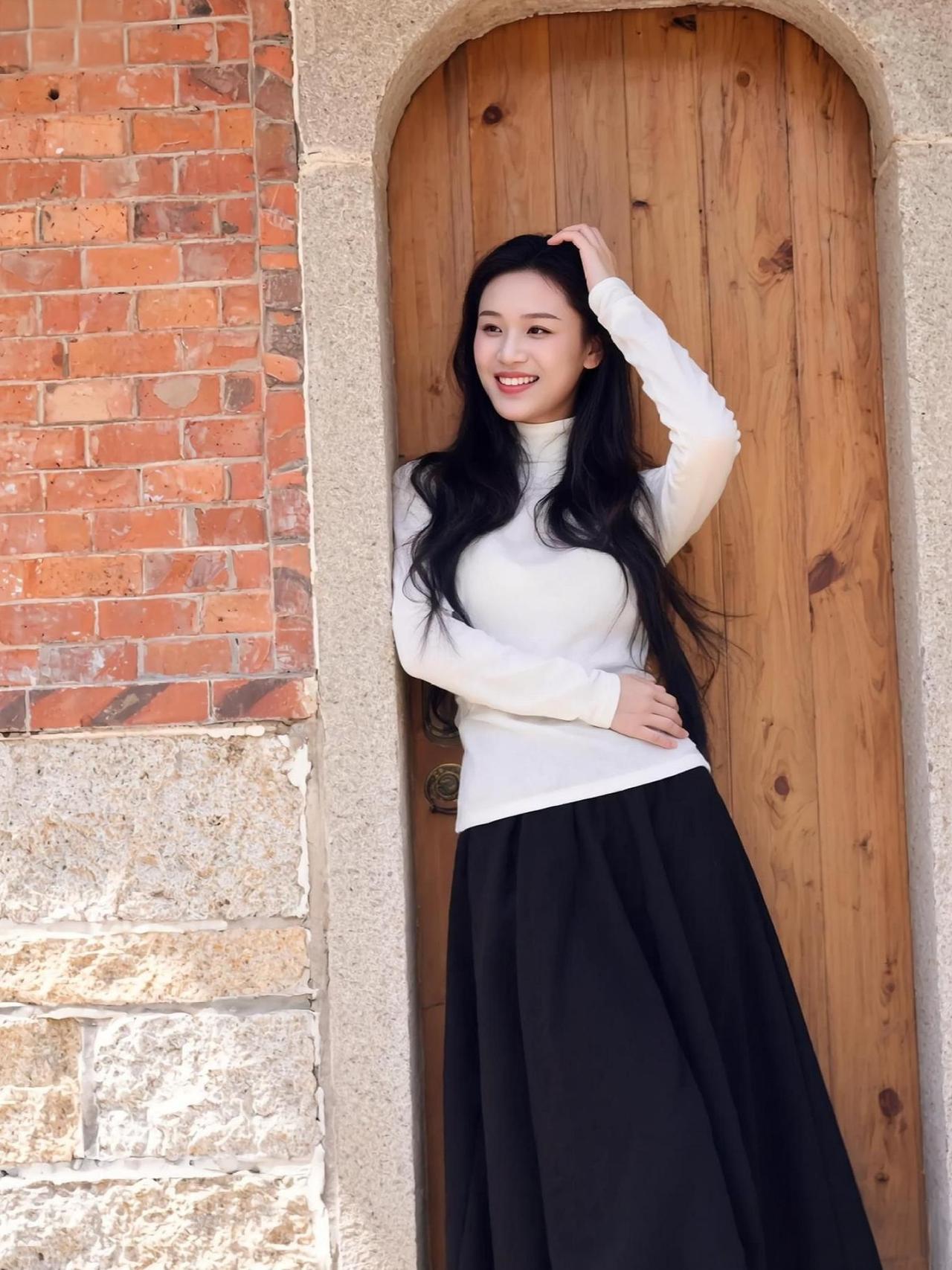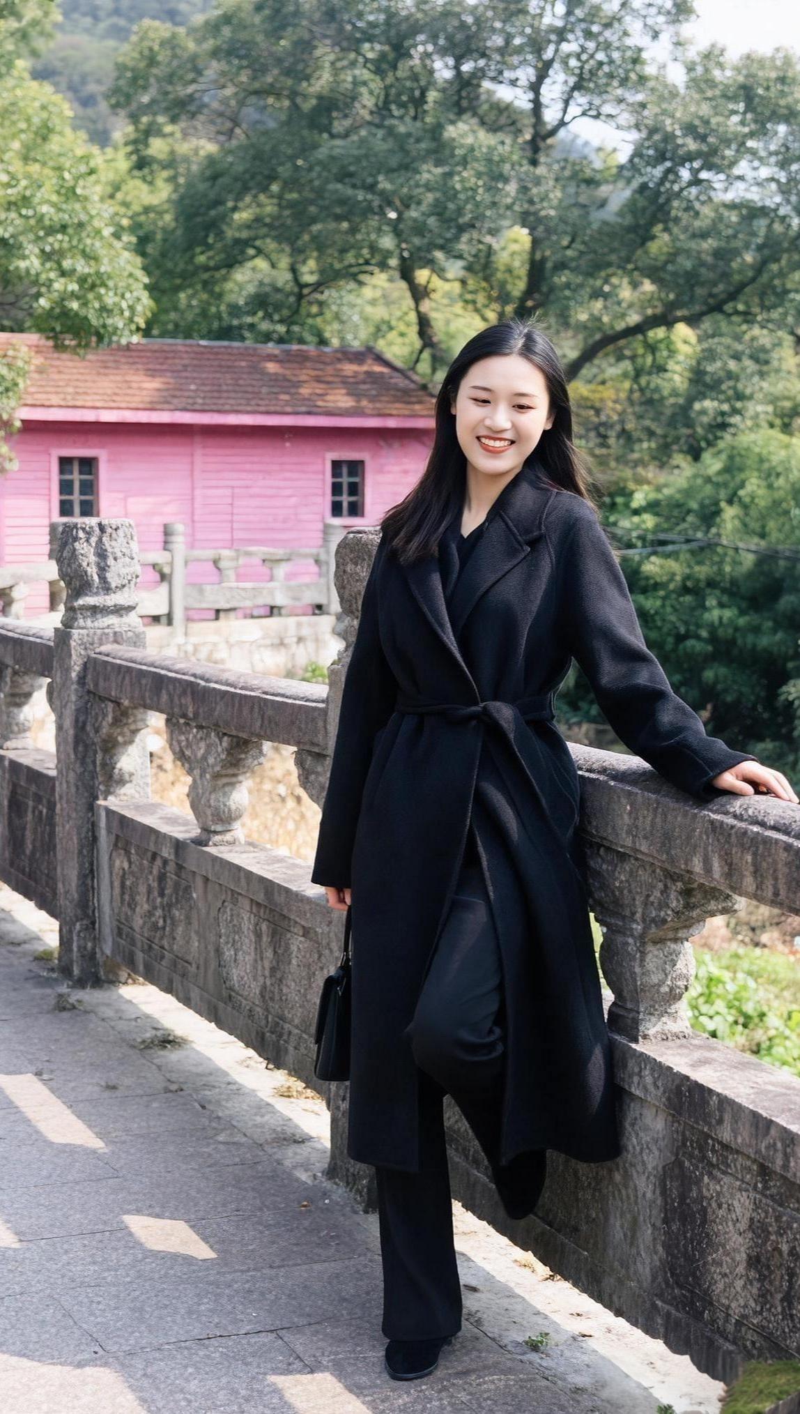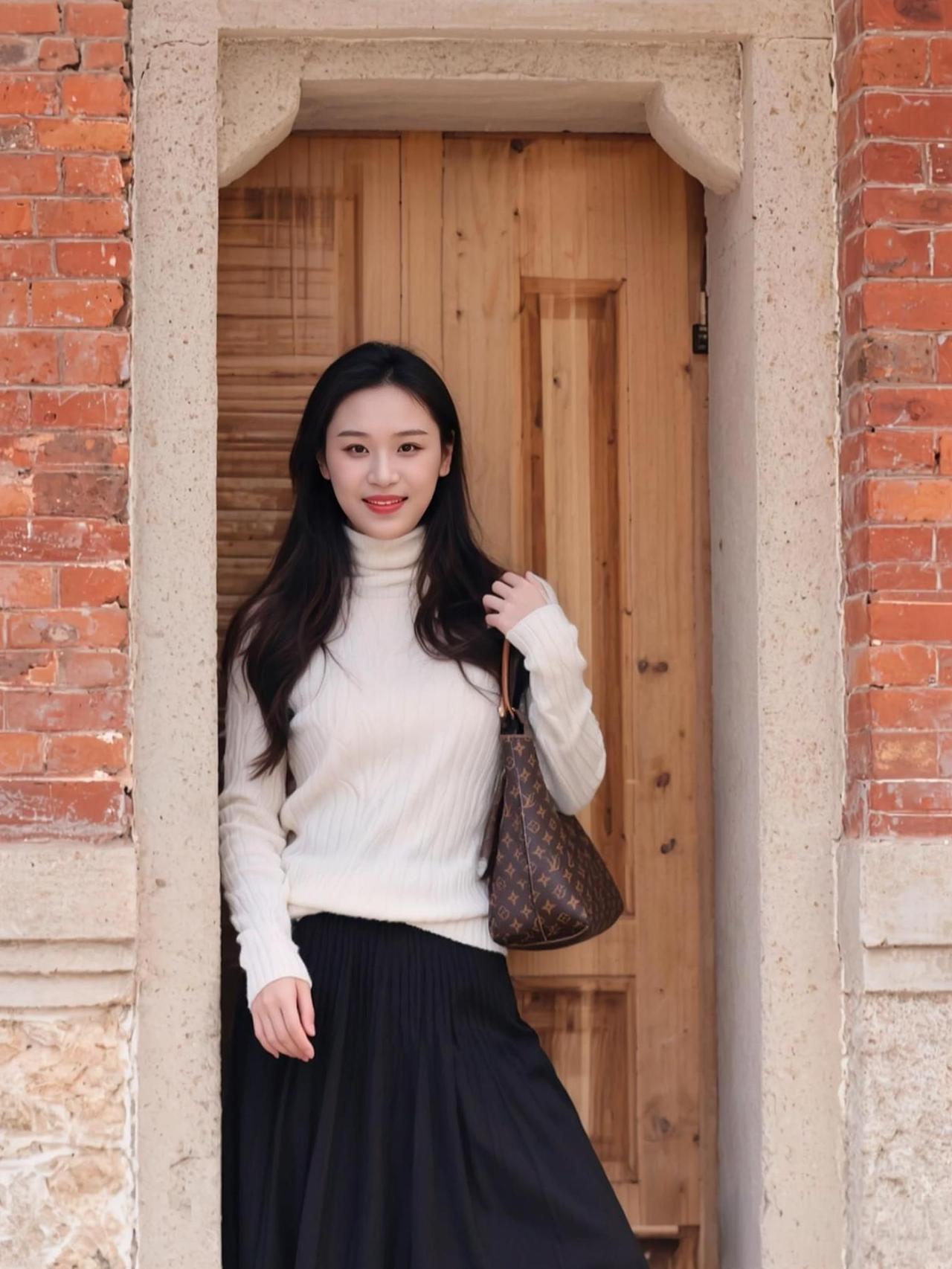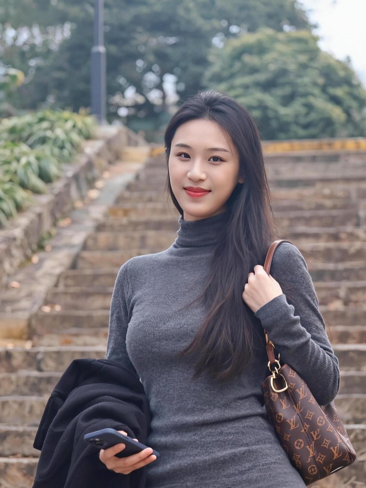 石阶叠着初冬的余温 青苔藏起了季节的脚步声 你从光影里走来 灰色的针织衫裹着柔软的轮廓 长发垂落,像未散开的流云 唇上的红,是寒日里跳脱的星 手指轻勾着包带的弧度 腕间晃着焦糖色的纹章 手机贴在掌心,握着未说的话 风掠过发梢时 你的笑,漫过了石阶的冷 把江南的温柔,揉进了这一刻 石级逶迤覆绿苔, 佳人拾级笑盈腮。 高领裁云凝素影, 长鬟垂玉拂香埃。 轻拈蔻色唇间晕, 漫绾筠囊肘际偎。 风软江南春未远, 眸光一盼胜花开。 女性应有的气质 温柔高贵的女性 轻熟女人味 古典气质女孩 古典美人韵