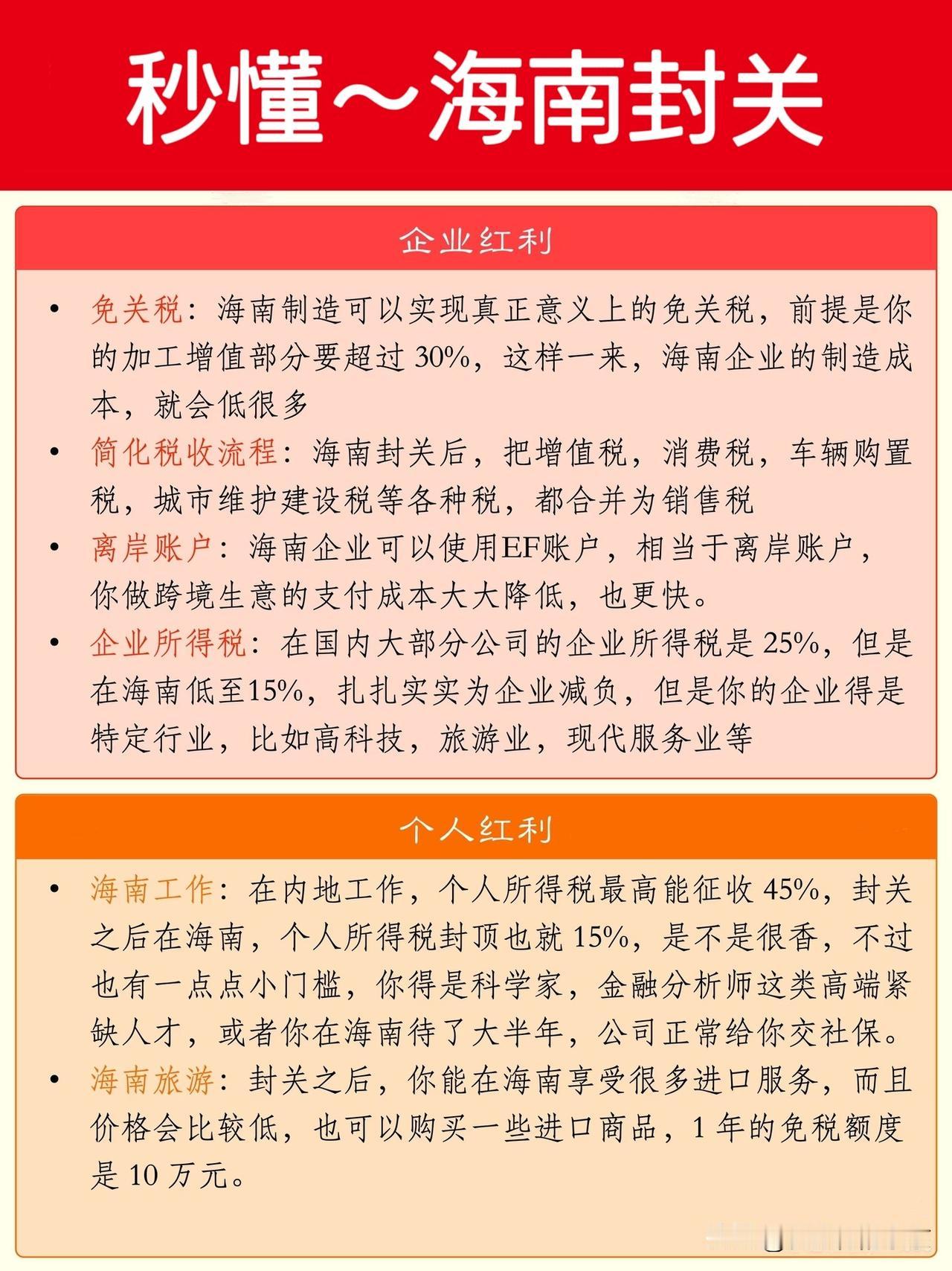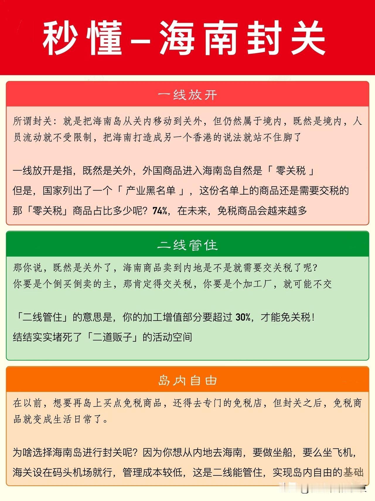 一图看懂~海南封关 啥是“封关”? 原来,海南封关是这样的~ “封关”离不开几个概念: 国内,境内,关内! 1️⃣, 国内~整个国家领土范围之内都叫国内,也叫疆域。 2️⃣,境内~我国实行一国两制,除了港澳台都是境内,港澳台是境外,从内地去港澳台要通行证,有边检,边检管人。 3️⃣,关内~境内和境外的边界社机构“海关”。 没封关前,海南是境内关内,封关后,海南就是境内关外了。 那么海南封关对海南有啥意义呢? 海南的民生会提高吗? 海南 海南封关