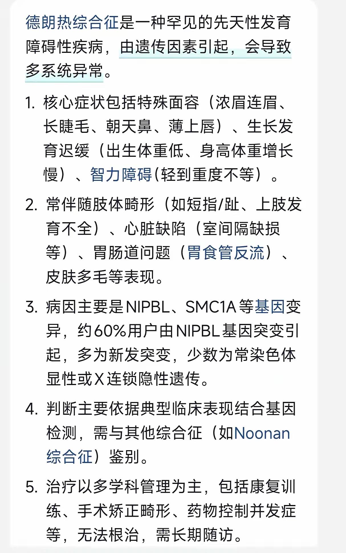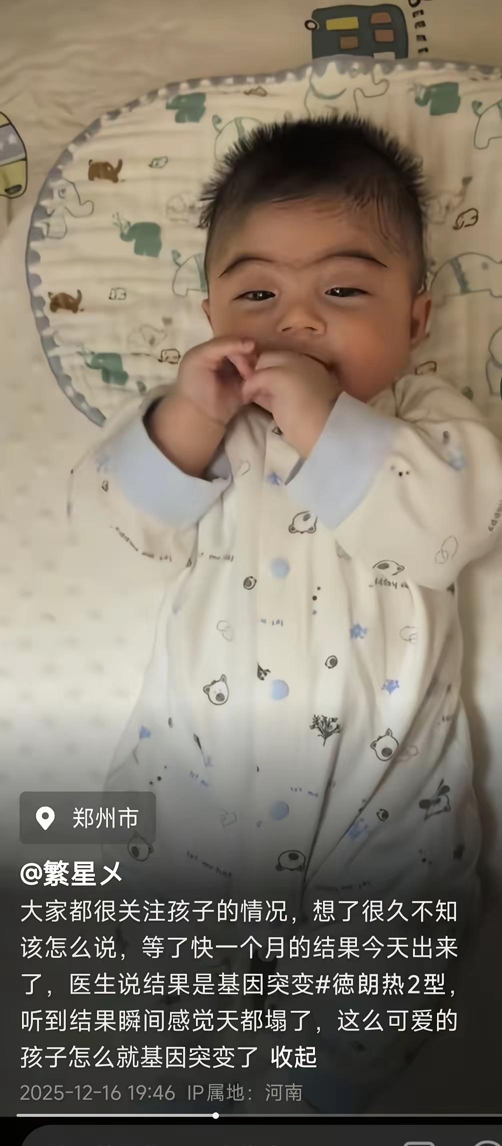 这个孩子真确诊了!网友真是神奇!是优秀的医生也上网冲浪! 当初这个妈妈上网发了孩子的视频求助广大网友,问为什么孩子三个月了,体重这么轻,才九斤。网友纷纷支招留言,说有可能是德朗热,希望引起重视,及时去检查。 没想到孩子妈妈也听劝。马不停蹄的就去了郑州医院看看。一个月了,也知道网友关心就诊情况。上网给大家汇报了,的确是德朗热二型。医生说发现的早,及时干预,效果会好一点。 这是一种基因突变型疾病,表现很明显。连眉,细长眉毛,上嘴唇薄,体重轻等有孩子的家乡不要掉以轻心,及时发现,早治疗。孩子是家里的心头宝。希望孩子们都健健康康的。希望这个小孩健康成长。 这是一个听劝的宝妈。也有一群热心的网友。算是一个温暖的故事。