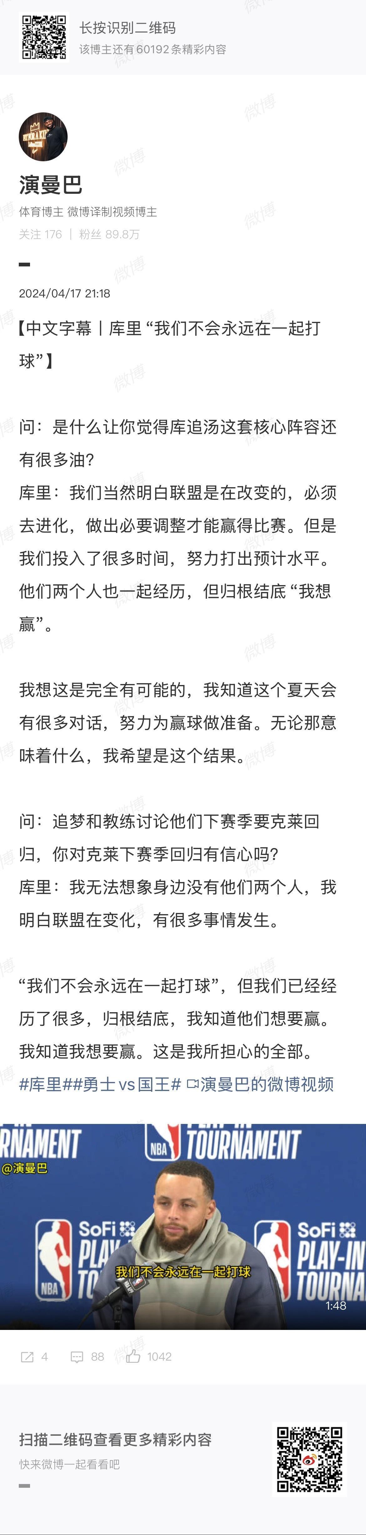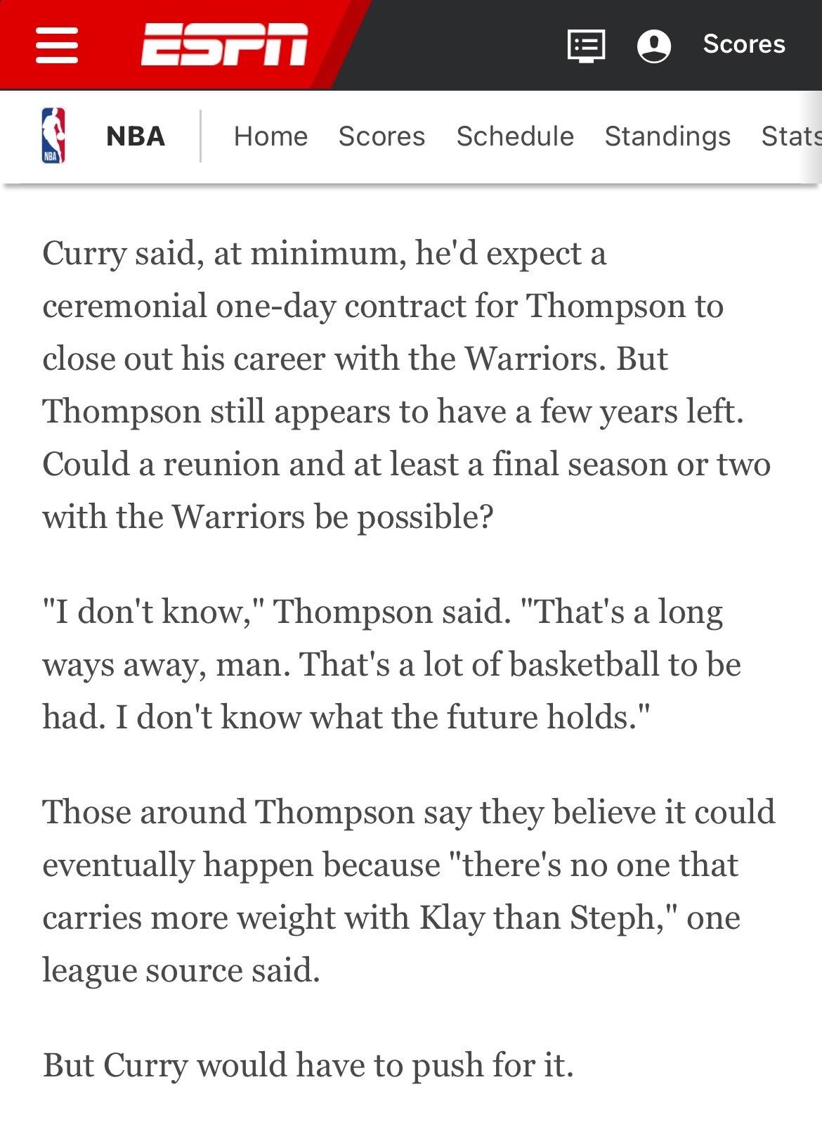 呼之即来挥之即去?库里谈及与克莱可能重聚时表示:“我真希望他还留在这儿……那会是不可思议的事。如果真到了那个时候,要是能聊起这件事,我肯定会给他打电话,跟他说‘我们希望你回来’。” 库里表示,他至少期待勇士能为汤普森签下一份象征性的一日合同,让他在勇士结束职业生涯。但汤普森看起来仍有几年的职业生涯可走。他是否有可能重返勇士,至少再打一两个赛季?“我不知道,”汤普森说,“伙计,那还太遥远了。接下来还有很多比赛要打,我也不知道未来会怎样。”汤普森身边的人表示,他们相信这件事最终可能发生,因为一位联盟消息人士称:“在克莱心中,没有人比斯蒂芬更有分量。”但这需要库里去推动。
