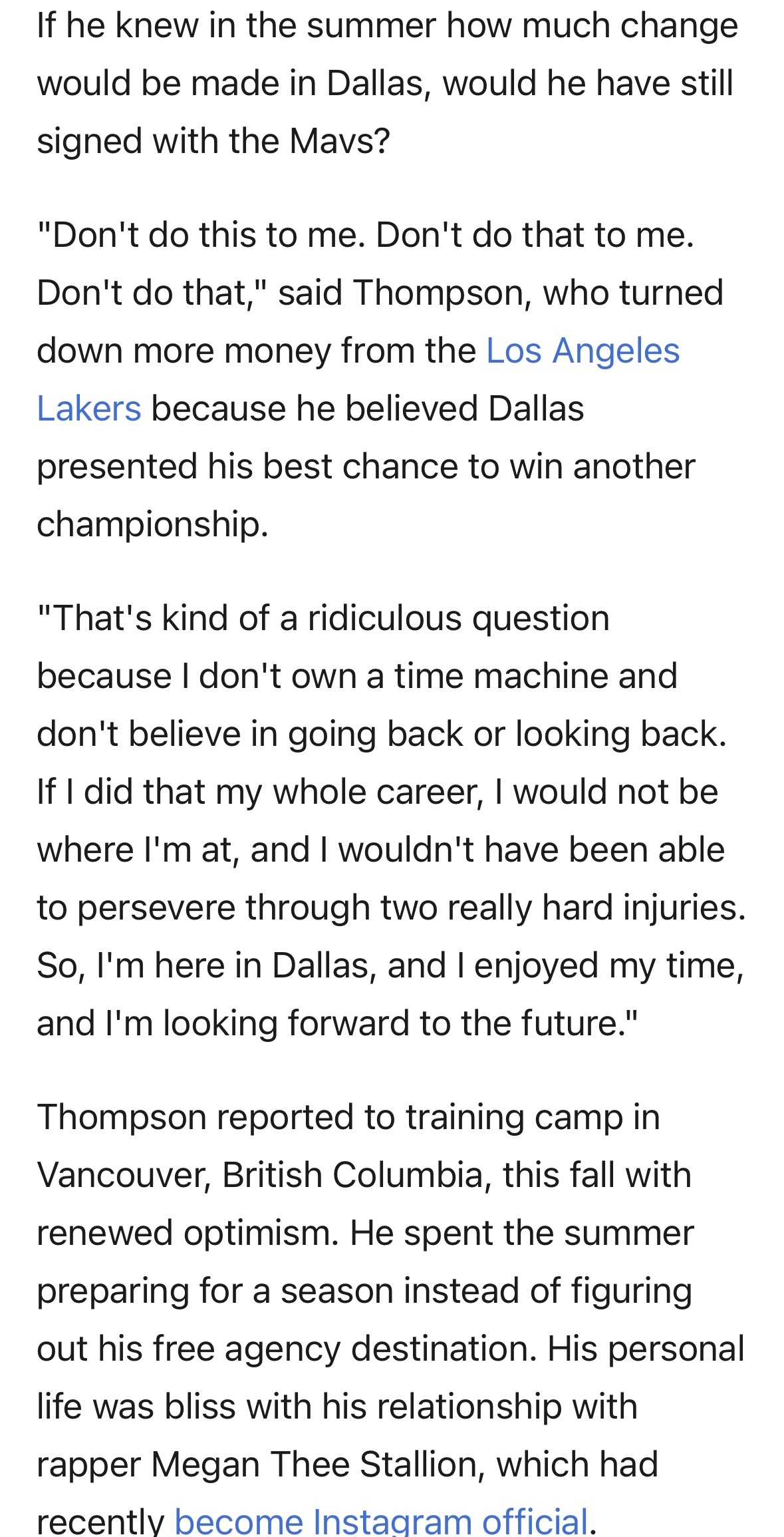 克莱被问及,如果早在休赛期,他就知道达拉斯会迎来如此大的变动,他还会选择签约独行侠吗?“别这么问我,真的别这么问。”汤普森如是说道。此前他拒绝了洛杉矶湖人开出的更高年薪,只因他相信达拉斯才是他冲击生涯又一座总冠军奖杯的最佳归宿。“这问题问得有点离谱,我又没有时光机,也从来不喜欢回头看、走回头路。要是我整个职业生涯都这样患得患失、瞻前顾后,我根本走不到今天这一步,也不可能熬过低谷期那两次严重的伤病。所以我现在就在达拉斯,在这里的日子很开心,我更期待的是未来。”