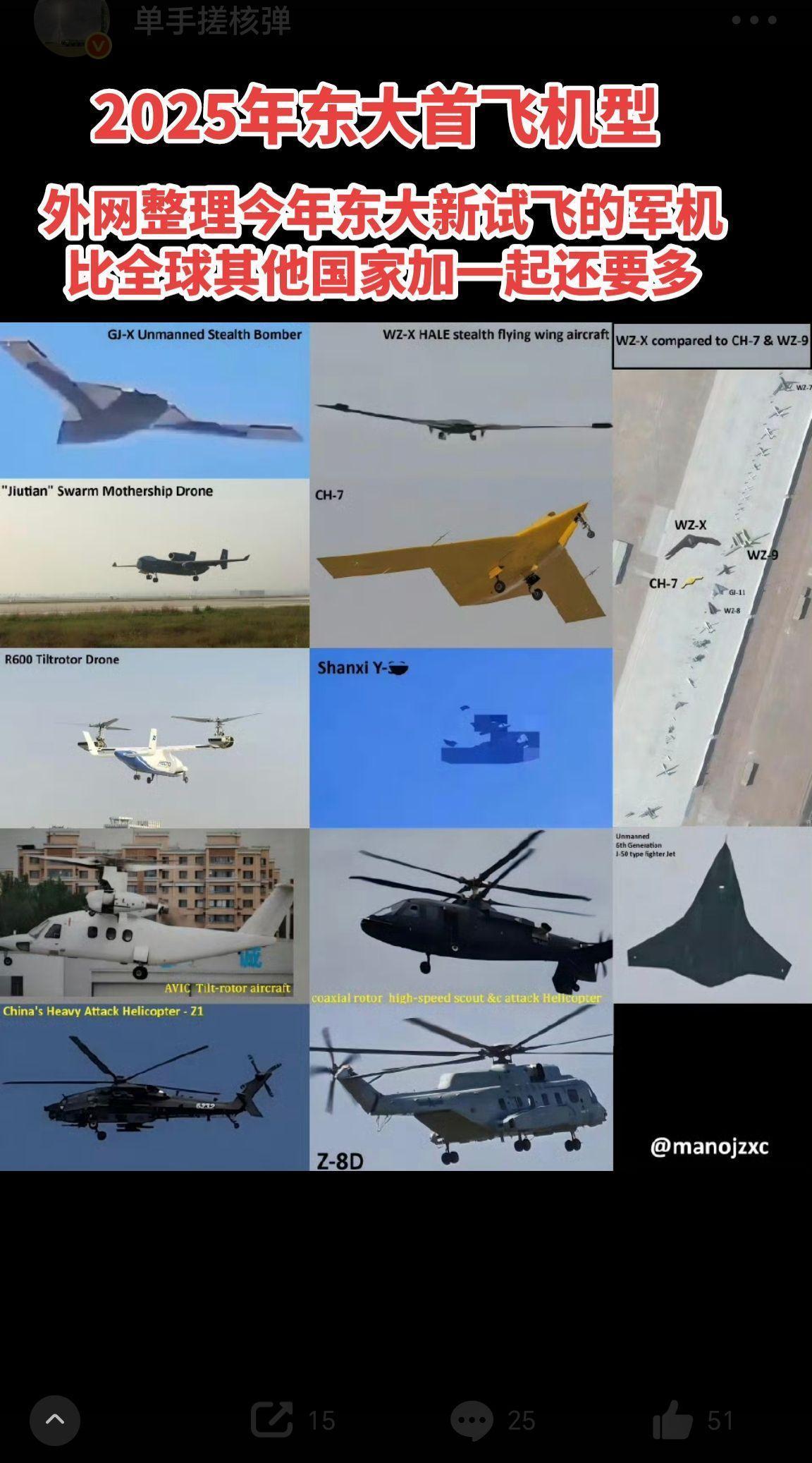 外网博主整理今年以来东大新试飞的军机一览图,绝对比今年全球其他国家新试飞的军机加一起还要多。今年还剩下半个月,不知道还有没有新惊喜。军迷发烧友 国之重器