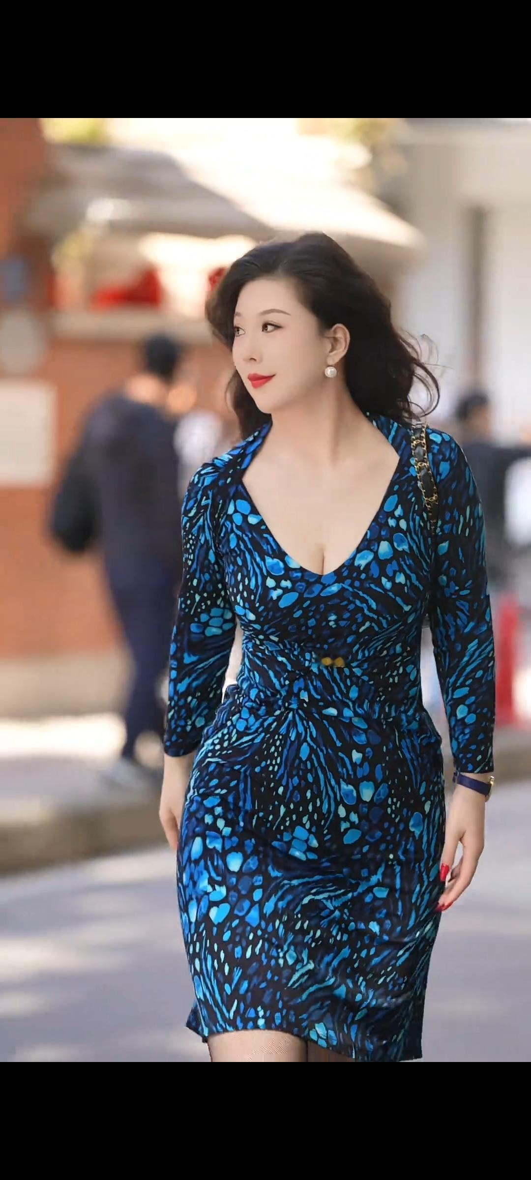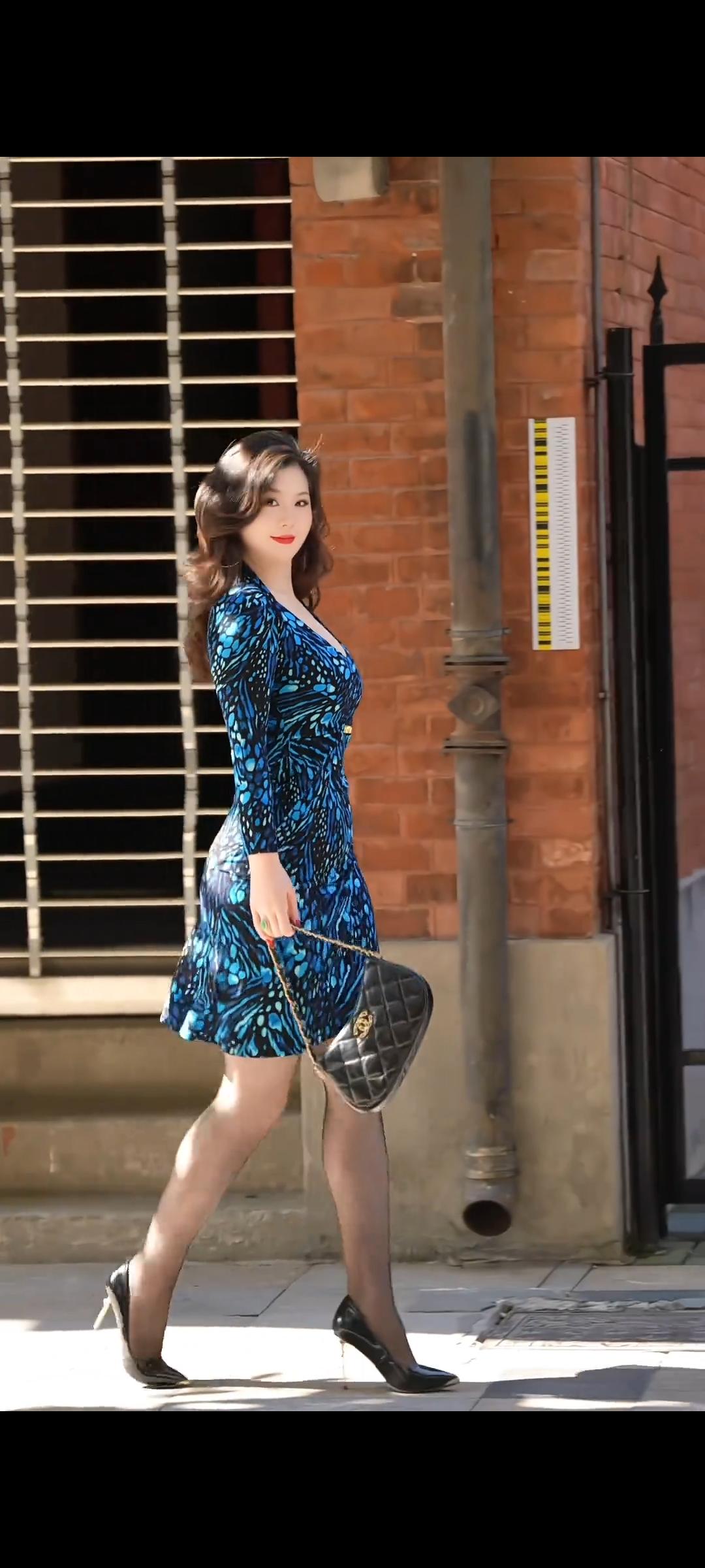 宝蓝裙装迷人的韵味。 一袭宝蓝印花裙,带着时光滤镜的温柔与张扬。利落的线条展示出曼妙的身材,黑丝与精致配饰点睛,复古韵味风浓,红砖街头的光影交错,每一步都踩在优雅的节奏里。不刻意的时髦,才是最动人的风情。