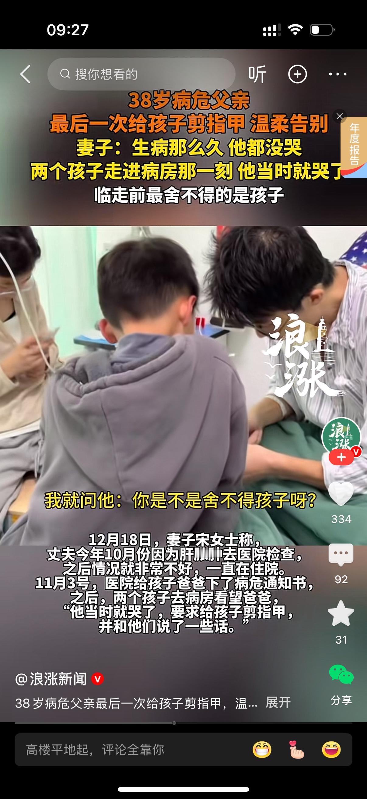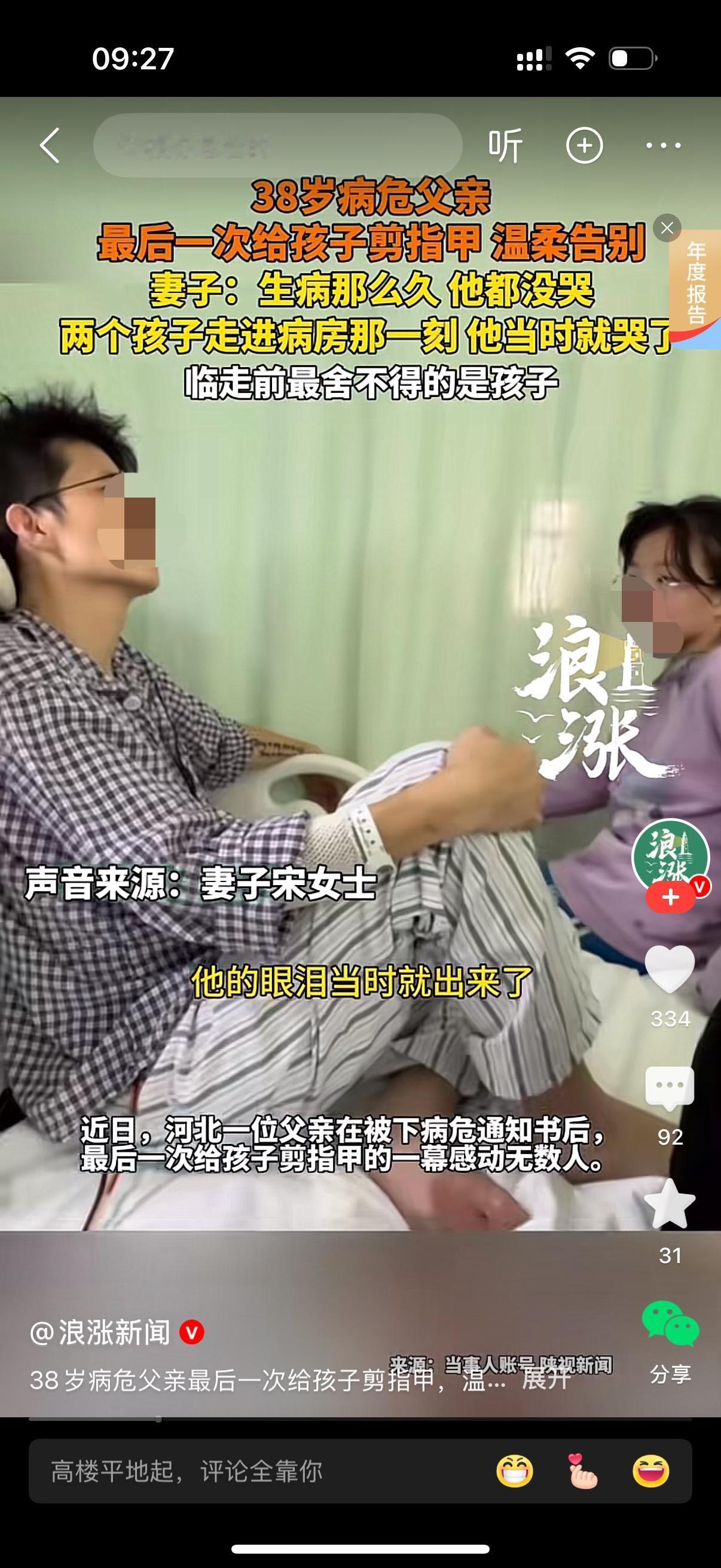 38岁父亲病危,弥留之际,最后一次给孩子剪指甲。妻子说丈夫生病那么久,他都没有哭,但当孩子走进病房的那一刻,他当时就哭了,他临走前最舍不得的就是自己的孩子。是啊,可怜天下父母心,哪个父亲不爱自己的孩子呢?希望这位父亲在天堂继续守护自己的孩子,他们一定会健康快乐的长大。