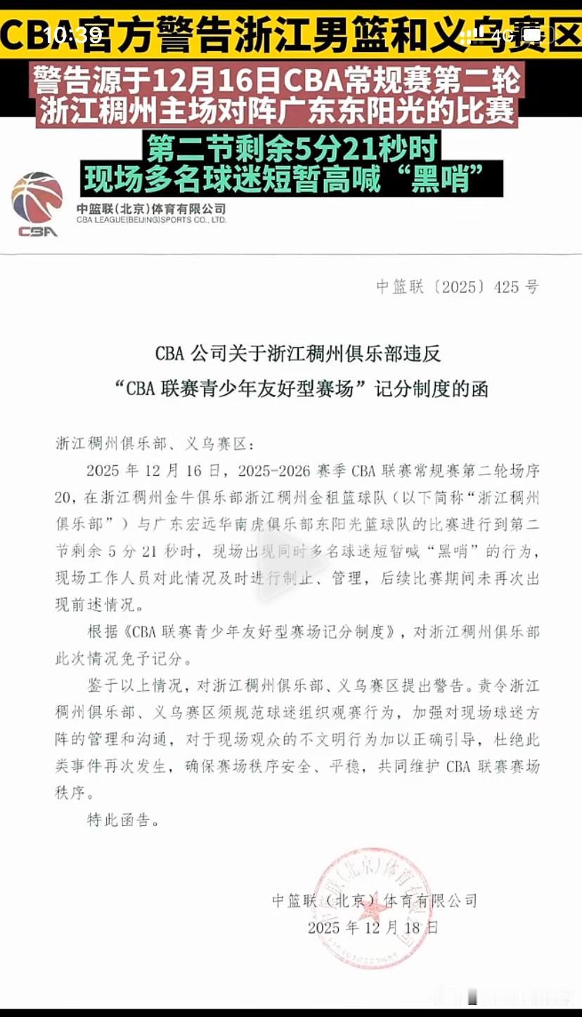 CBA官方警告来一份! 联赛官方责令该俱乐部及义乌赛区,切实规范球迷组织观赛行为,强化现场球迷方阵管理引导,杜绝同类事件再次发生。 好一招,有问题就解决提出问题的人,而不是改进,解决问题,第一时间先把提出问题的人给解决了,那就没有问题了。北京球迷现场骂人比喊黑哨严重多了都没有警告,是不是有什么特权? CBA可能是世界上唯一个敢硬刚球迷的联赛,我花钱买票看球,还得跟个孙子似的,你让说啥才能说啥啊