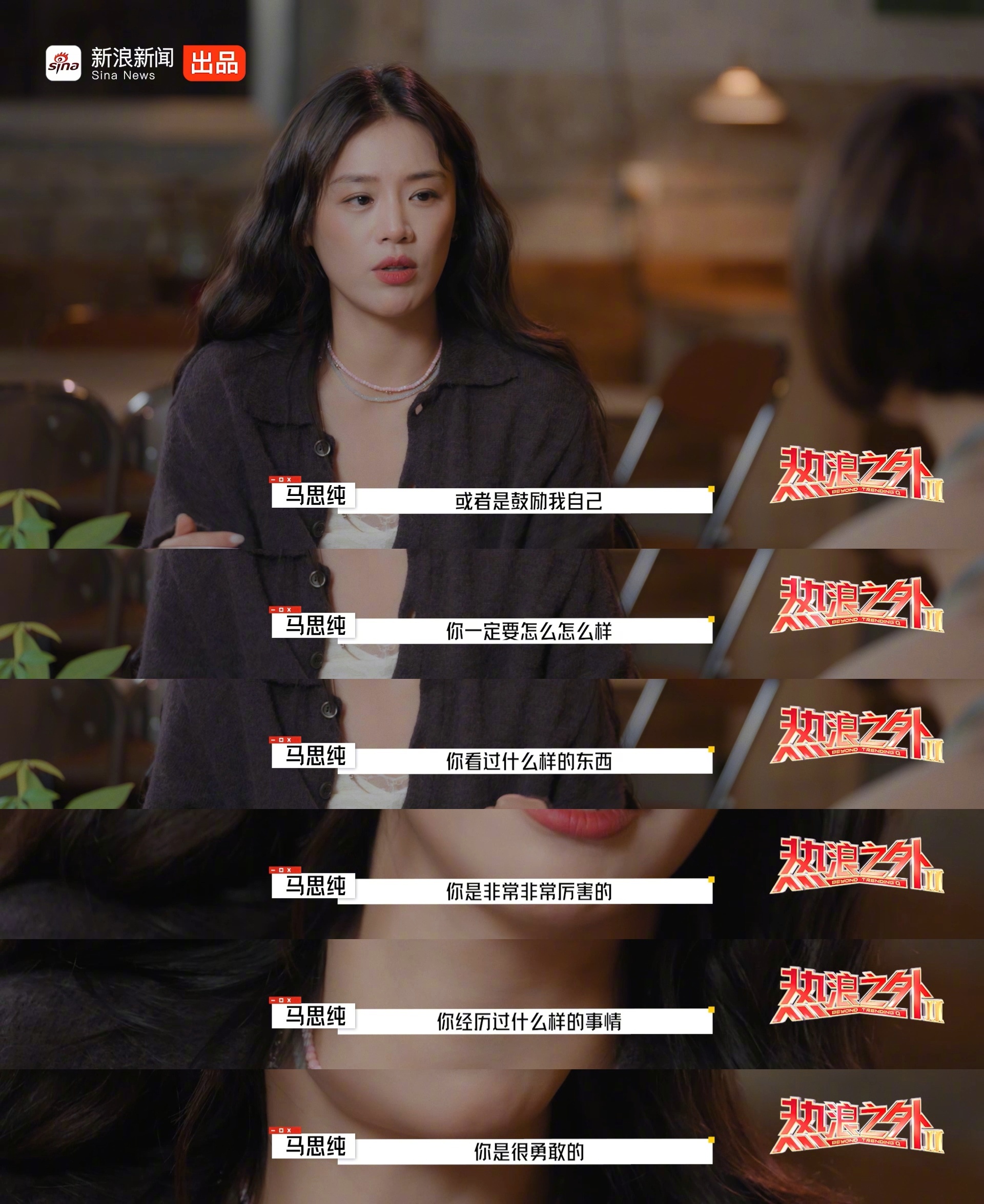 马思纯3岁就知道女人要独立马思纯是如何给自己打气的?在和鲁豫的对话中,马思纯自爆会在房间中大声鼓励自己:“你一定要怎么怎么样,你看过什么样的东西,你是非常非常厉害的,你经历过什么样的事情,你是很勇敢的!”热浪之外