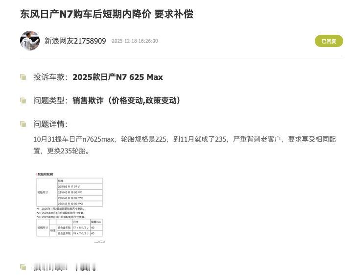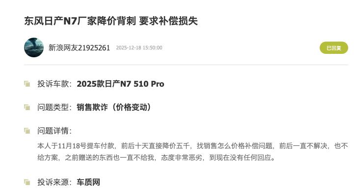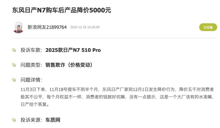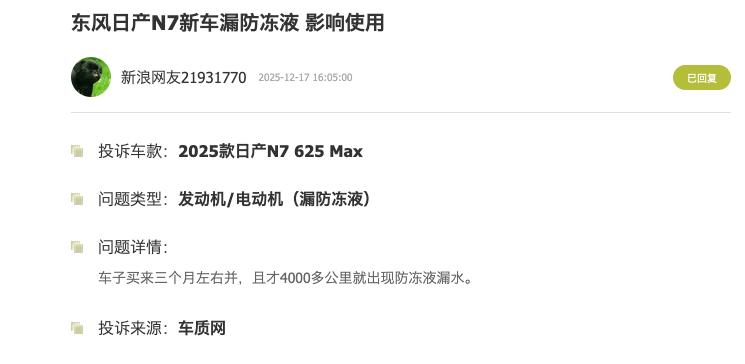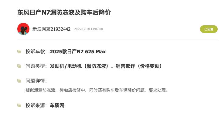 日产 N7新车槽点扎堆,车主闹心!日产N7 有些车主提车才三个月、跑了四千公里,N7 的防冻液就漏了。有些就车机卡顿到被车主吐槽是 “智障” 机。有些更加闹心的是,前脚刚提车,后脚就遭厂家降价 “背刺”—— 有的车主十天内亏了五千,更狠的是厂家还偷偷给轮胎升了级!背刺老车主 新车问题扎堆,售后还 “装聋作哑”,一边是漏液的隐患,一边是降价的寒心,日产 N7 这波操作,属实把车主的信任按在地上moca。 当初选车时的期待有多高,现在的失望就有多深。真心奉劝还没入手的朋友,慎选!别到时候买台“闹心车”回家,10几万花了,肠子也悔青了。