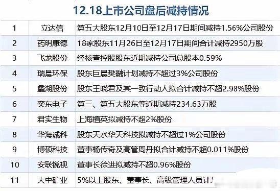 12月19日早间要闻一、个股公告四川路桥:获中邮保险举牌 持股比例达5%西部矿业:全资子公司格尔木西矿资源取得采矿许可证 该矿区拥有金金属量2.86吨维 信 诺:拟签署《投资合作协议二》推进合肥第8.6代AMOLED生产线项目 二期资本金94.43亿元许继电气:与华为数字能源技术公司签署的合作意向协议为合作框架协议海天味业:未来三年每年现金分红比例不低于80%二、停复牌南都电源:复牌,控股股东终止筹划控制权变更事项中微公司:停牌,筹划购买杭州众硅控股权旭升集团:停牌,控股股东筹划控制权变更事项三、个股避雷瑞晨环保:股东拟减持3.00%股份蠡湖股份:股东拟减持2.98%股份君实生物:股东拟减持2.00%股份大中矿业:股东拟减持1.44%股份华海诚科:股东拟减持1.00%股份绿亨科技:股东拟减持1.00%股份安联锐视:股东拟减持0.96%股份