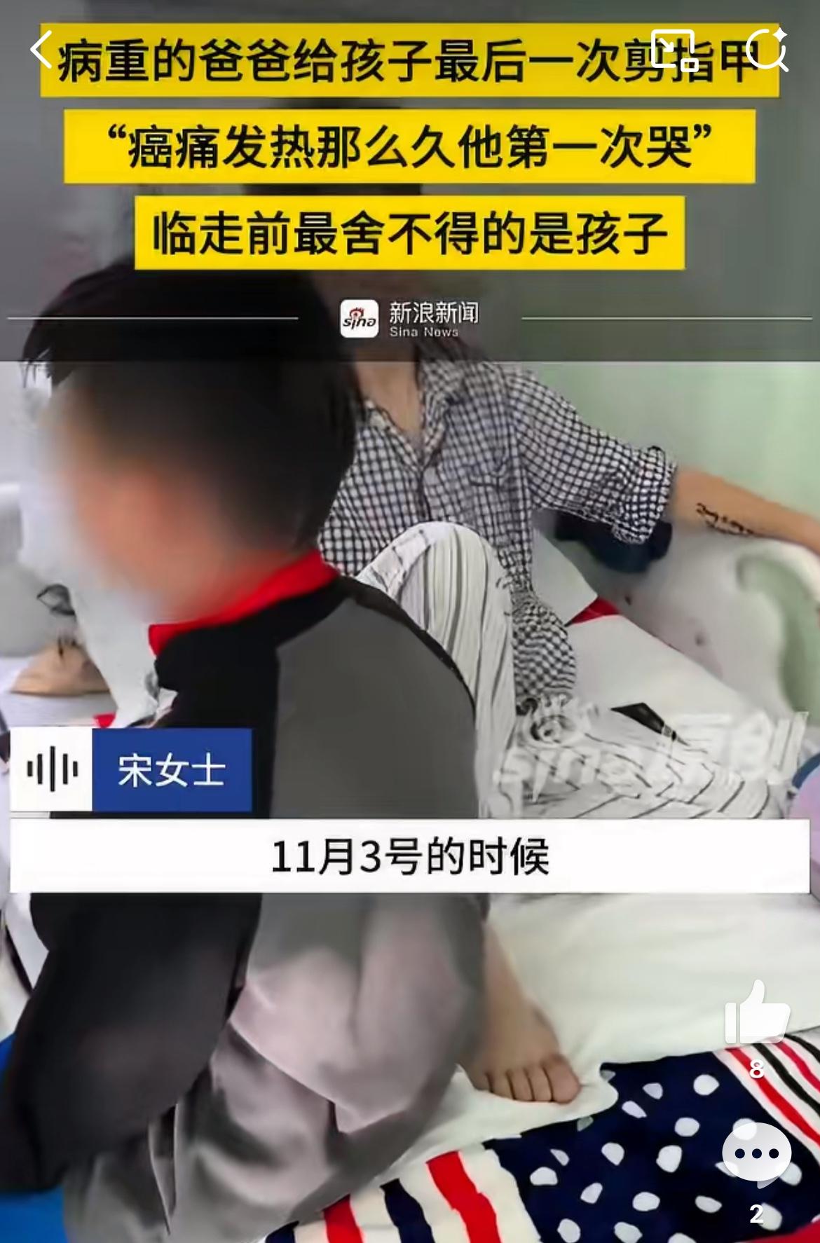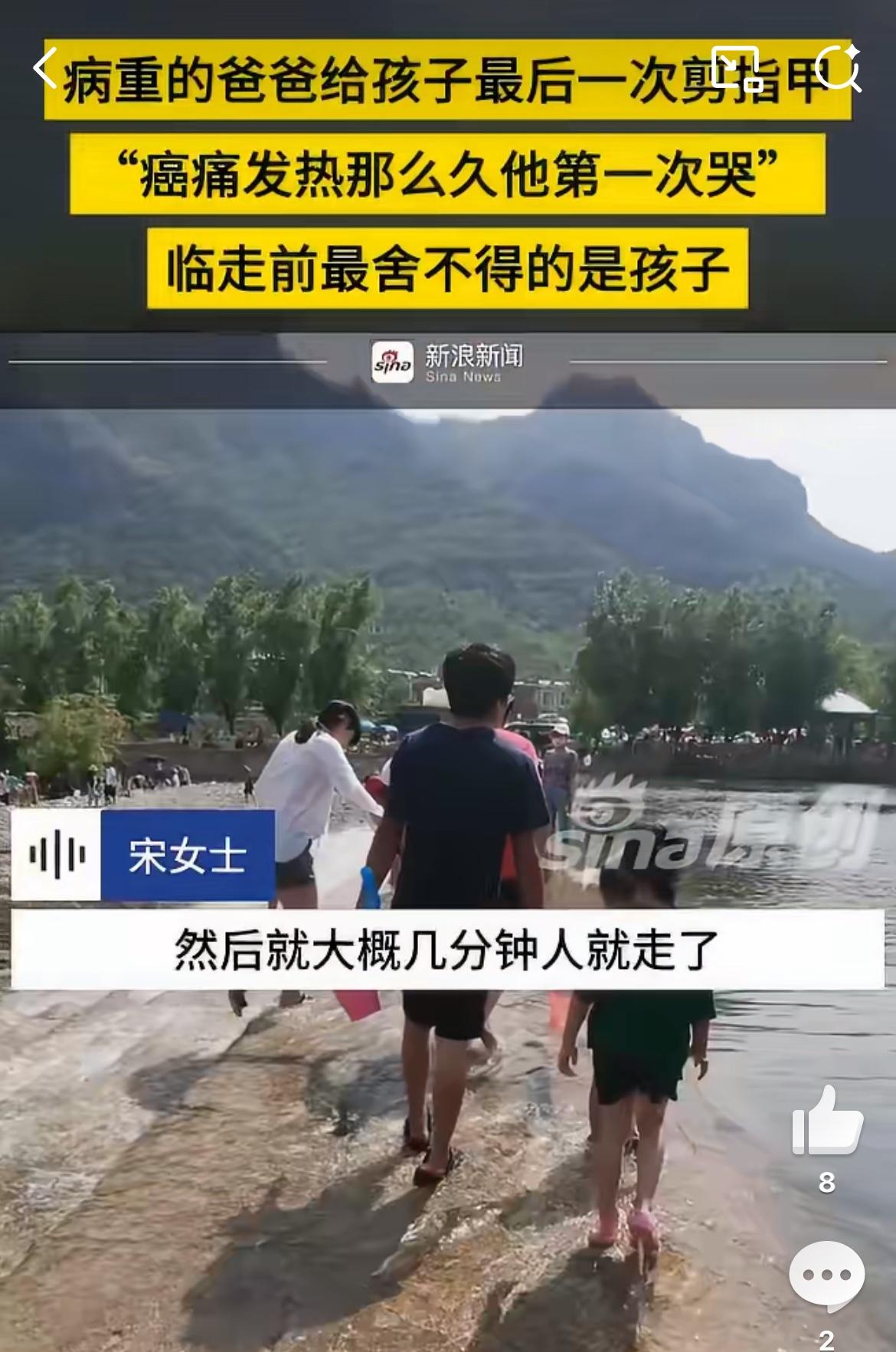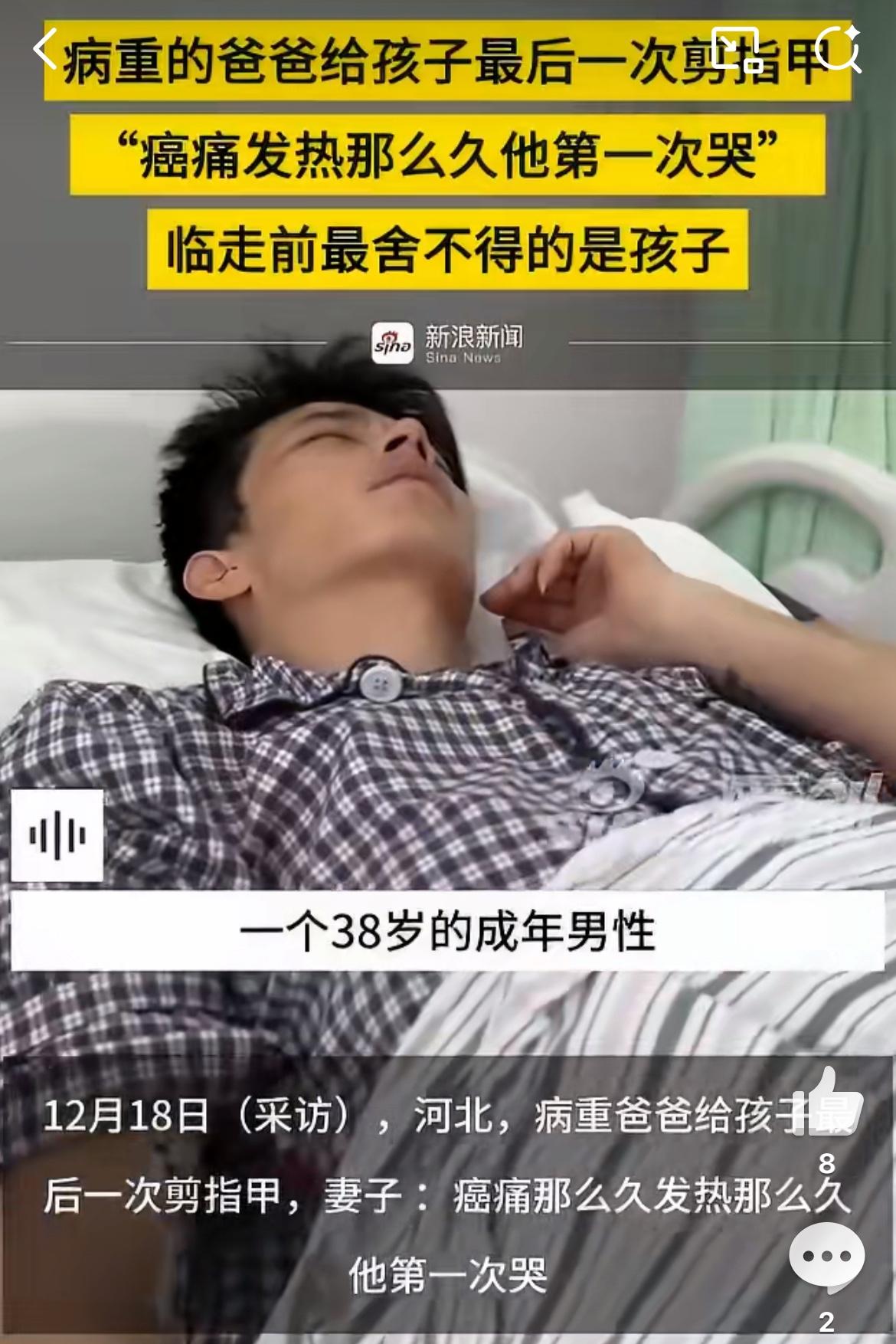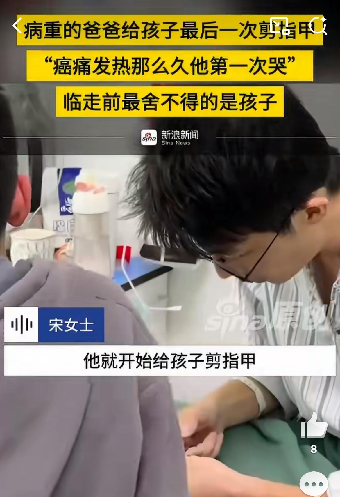 河北38岁肝癌晚期的爸爸给孩子剪指甲,看了令人泪目。给孩子剪指甲本来是家庭稀松平常的事,可是对于这个即将离去的爸爸来说,却饱含不舍和遗憾。孩子还没有长大,自己还没有好好陪伴,却要走了。疾病带来的生离死别,在这一刻让人动容。活着,就好好珍惜家人和眼前人吧。爸爸患癌症
