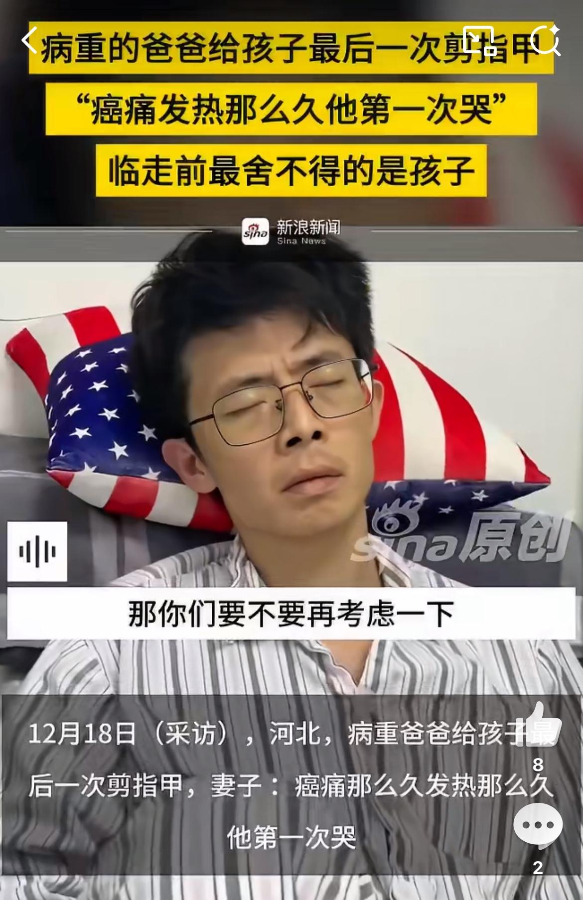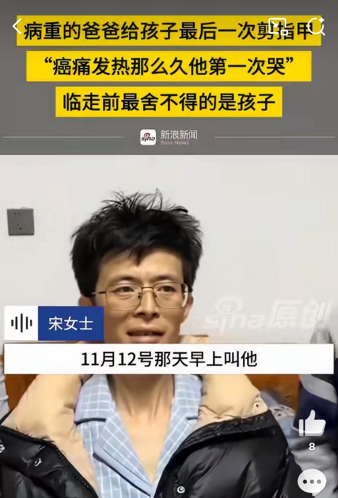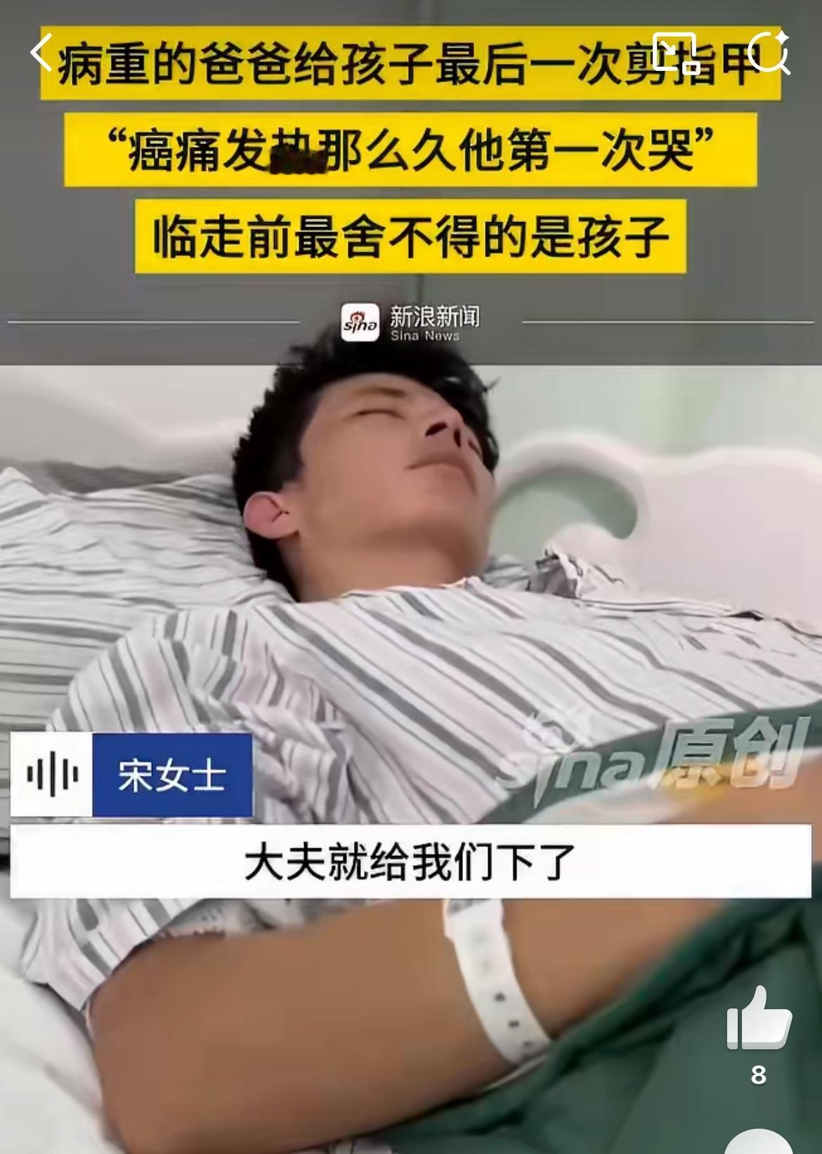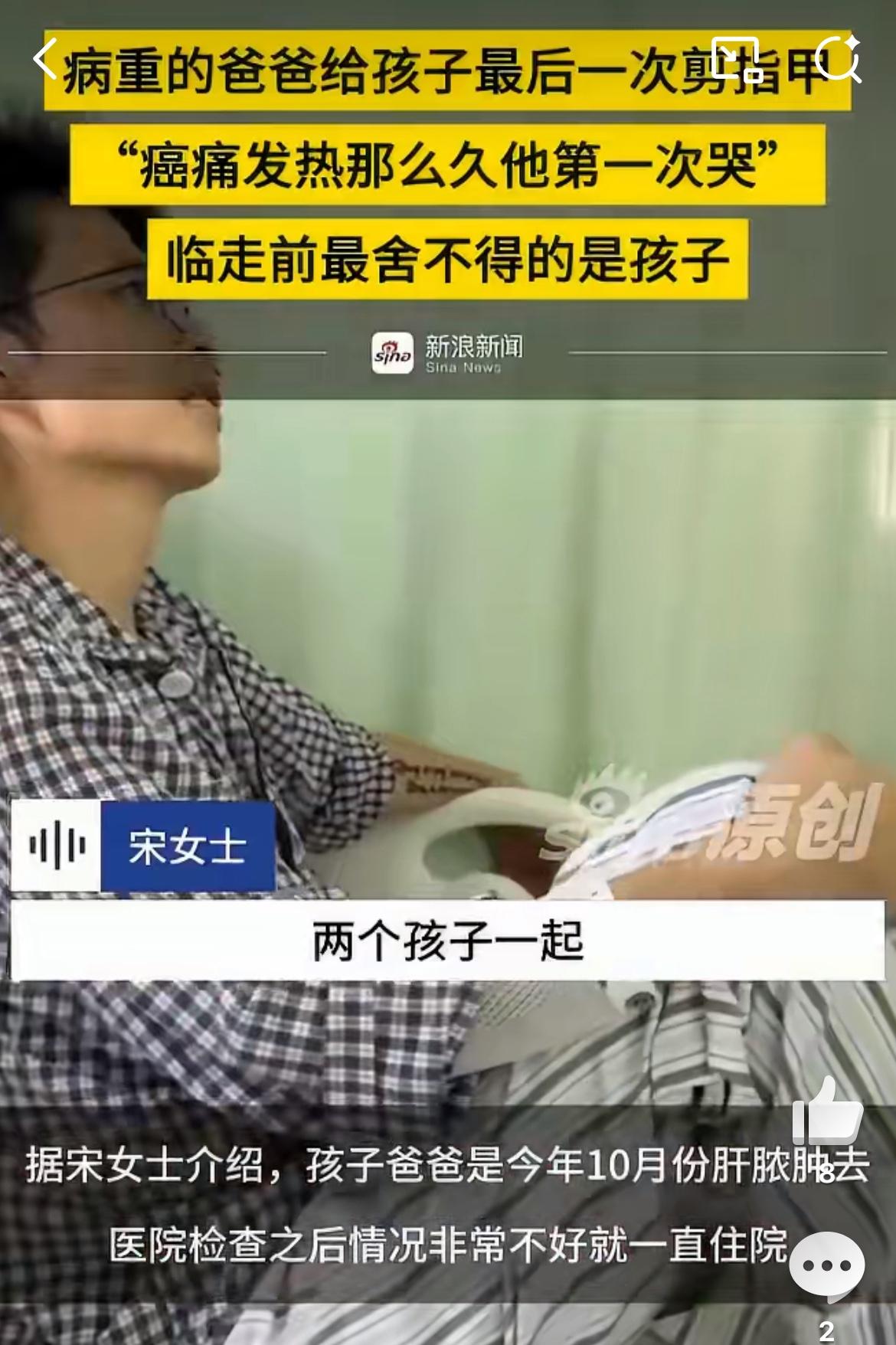 河北38岁肝癌晚期的爸爸给孩子剪指甲,看了令人泪目。给孩子剪指甲本来是家庭稀松平常的事,可是对于这个即将离去的爸爸来说,却饱含不舍和遗憾。孩子还没有长大,自己还没有好好陪伴,却要走了。疾病带来的生离死别,在这一刻让人动容。活着,就好好珍惜家人和眼前人吧。爸爸患癌症