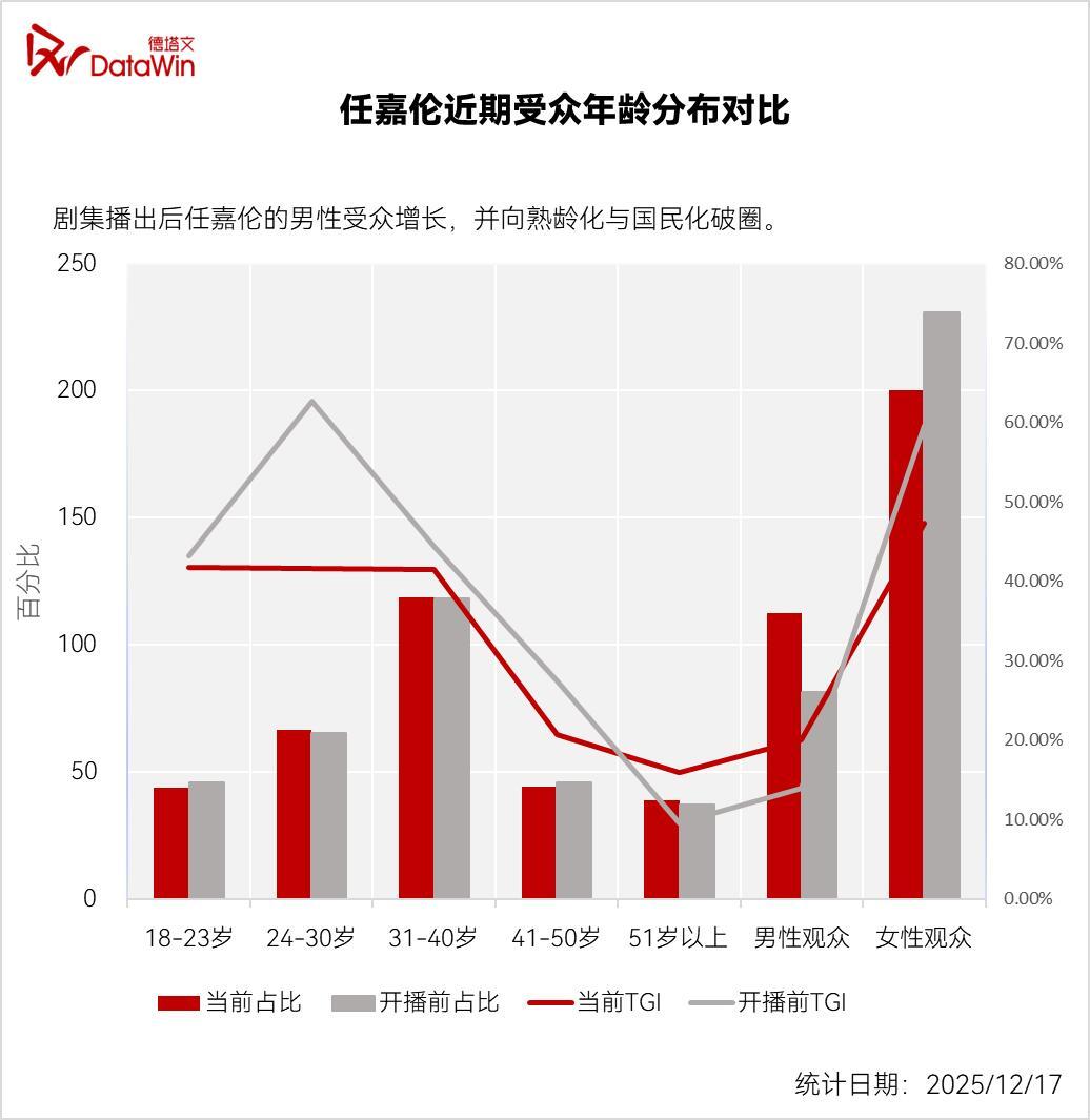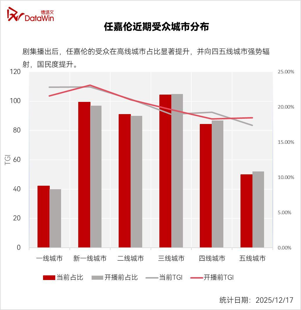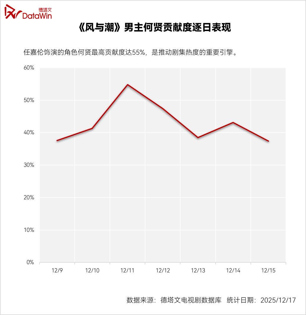 德塔文这次夸任嘉伦和上次不一样,上次《凤凰台上》是女性观众及一二线高消费力城市表现较高TGI偏好,说明商业价值转化率高!而这次《风与潮》不仅一二三线TGI高,四五线也非常高,足以说明任嘉伦国民度再次提升,还有不仅女观众居高不下,男观众也特别多!任嘉伦演活了何贤,全面破圈!
