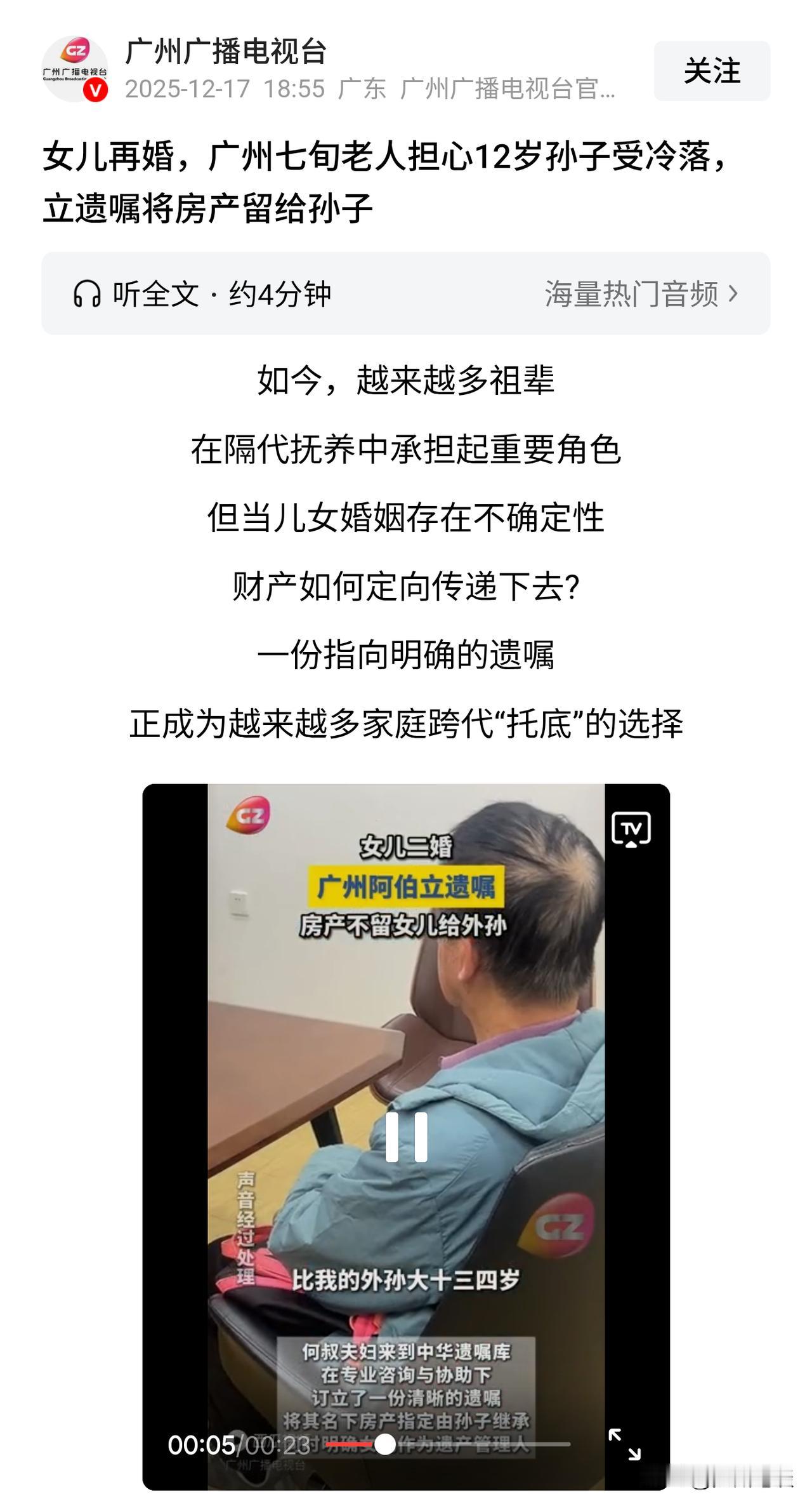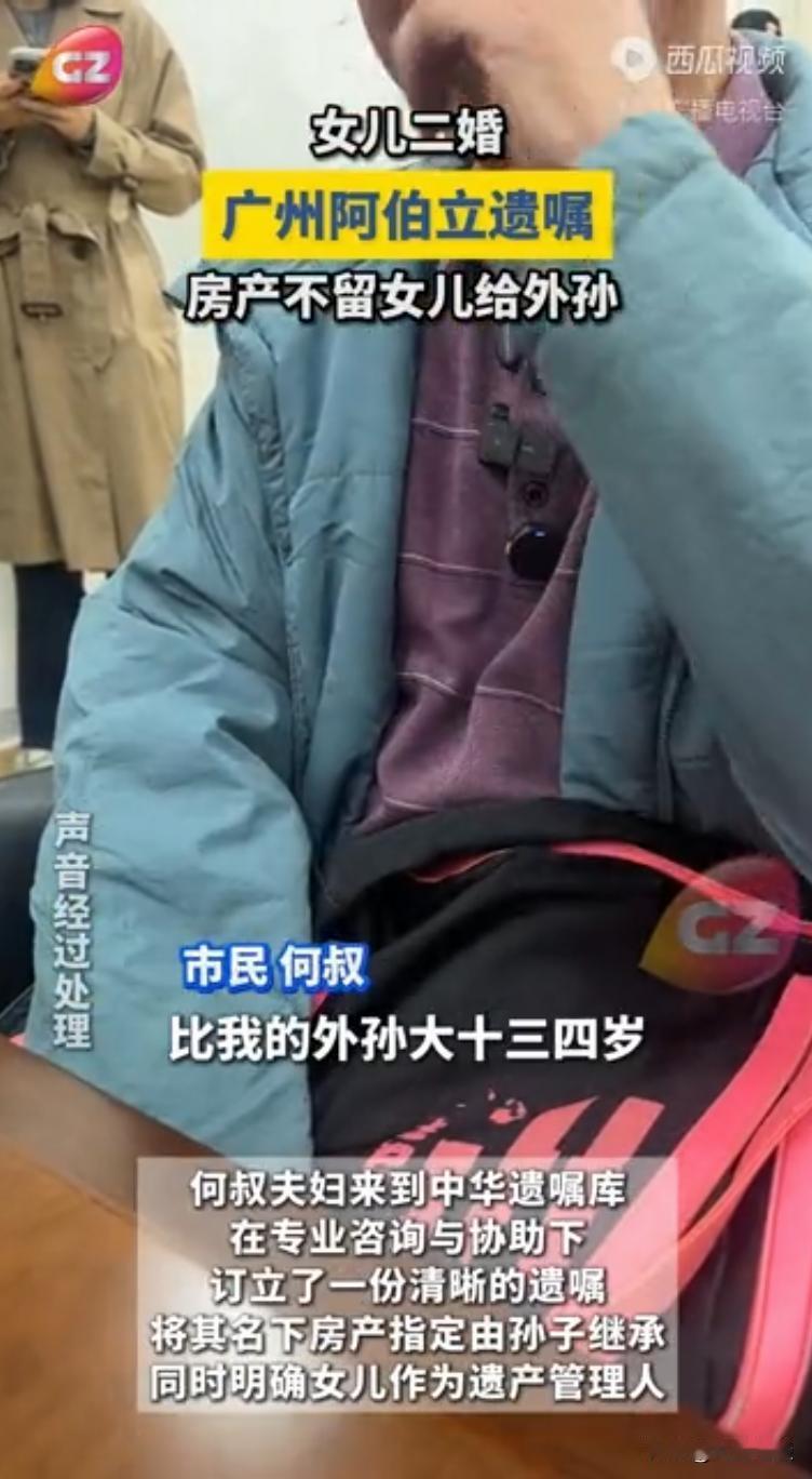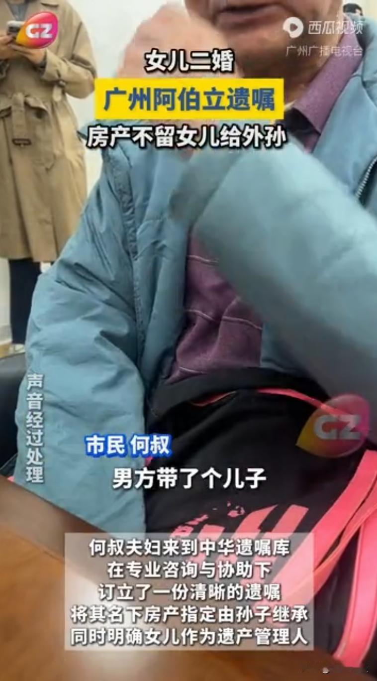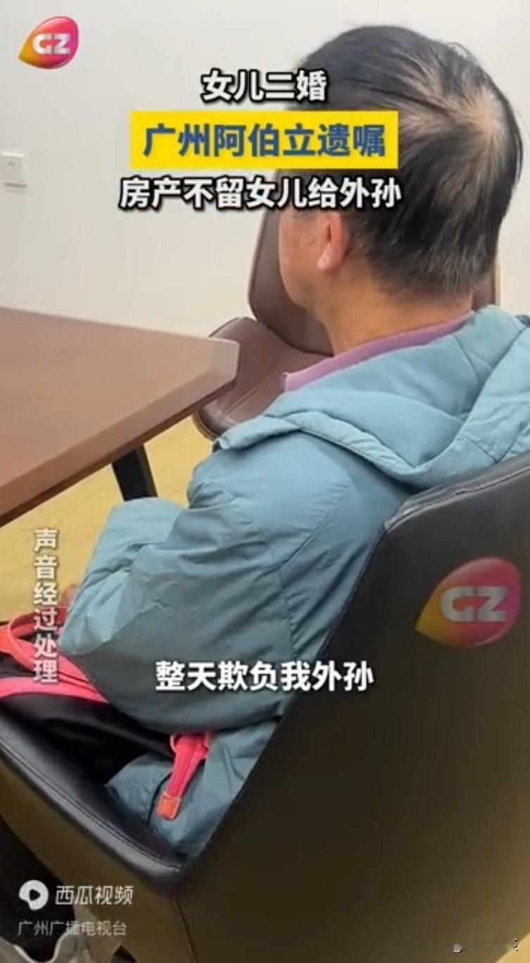 女儿再婚嫁给带男娃的强势男人,自己儿子被欺负! 广州七旬老人担心12岁外孙子将来被抢遗产,立遗嘱百年之后把自己的百万房产给外孙子,不给女儿! 女儿再婚,有喜有忧!喜的是女儿有了新家,忧的是自己的亲外孙经常被新女婿的儿子欺负! 只因女儿再婚丈夫也有一个儿子,并且大自己儿子十三四岁,经常欺负自己的孩子。 导致老人担心,将来房子给女儿后,最终可能落入外人之手,自己的亲外孙什么也得不到! 这种情况是有可能的,老人的担心不无道理。 如果将来老人的女儿早于女婿去世,那自己的房子就有四分之三属于女婿了,自己的外孙子本来就内向,肯定挣不过外人了。恐怕将来是什么也得不到。不如早早立下遗嘱,让自己的外孙子继承自己的房产,避免日后竹篮打水一场空。 在广州,哪怕是楼梯楼,绝大多数市区的房子也值百万以上。 如果电梯楼,二三百万都是起步,如果新一点的大一点的,至少四五百万了。 二婚男人还带个男孩,并且还经常欺负“弟弟”,这让谁都放心不下啊!