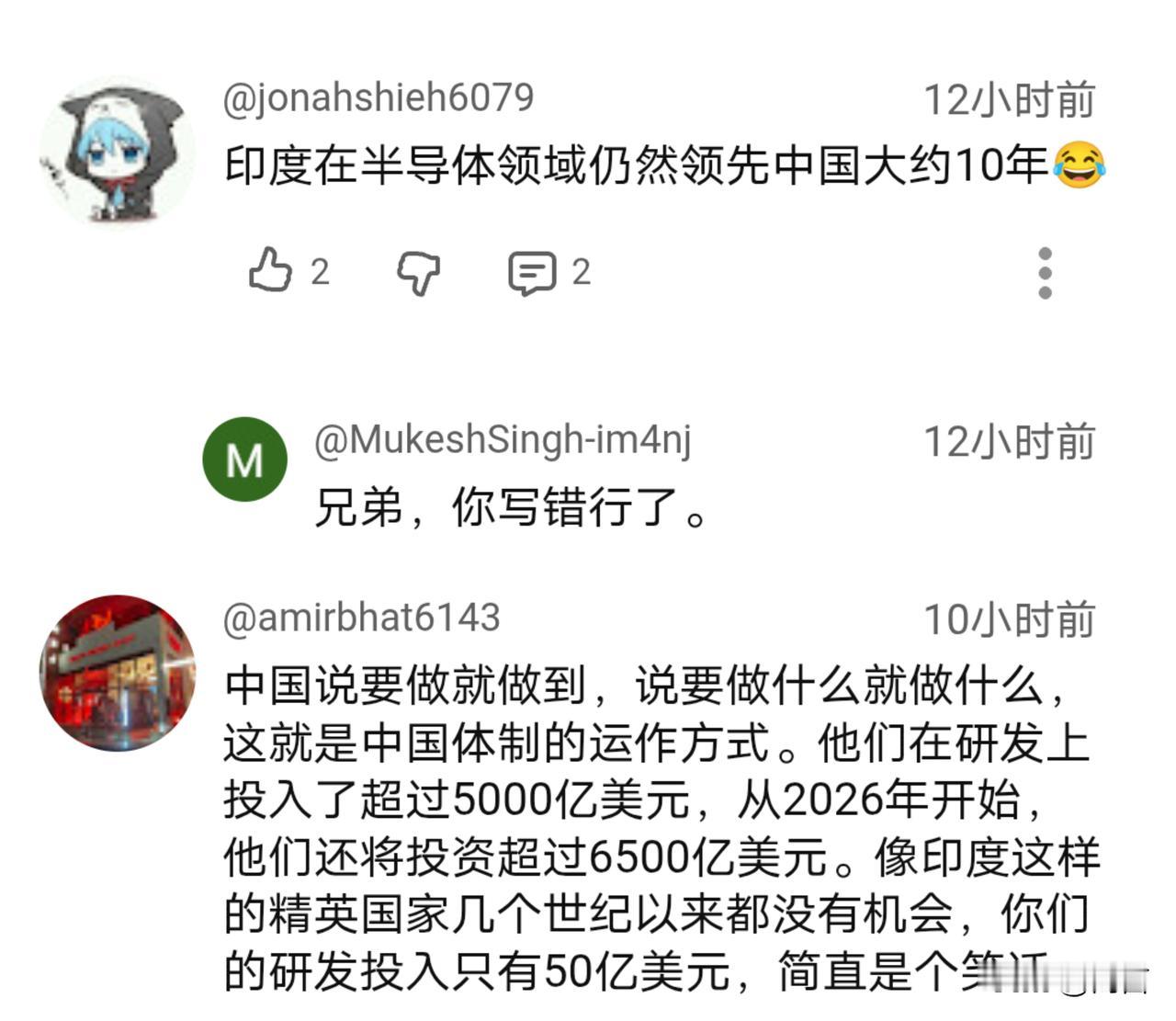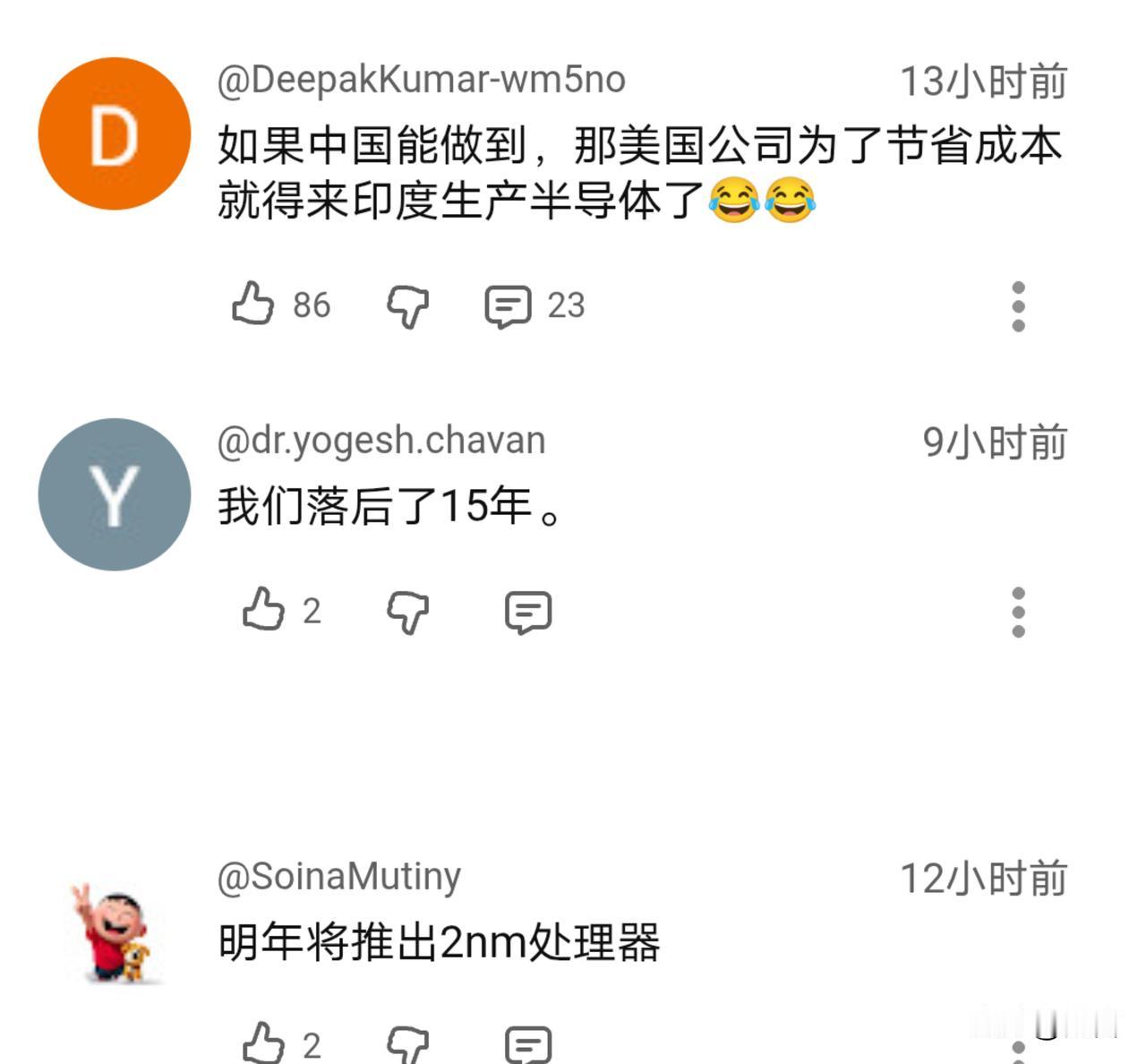印网友:中国行!印度同样可以做到。 12月18日,一位印博主表示,中国的半导体产业已经实现了自主化,并具备了生产高性能芯片的能力。预计,将于2028年左右实现大规模量产。鉴于中国的突破速度,美国应该和印度在半导体领域保持合作,以避免被超越。其给出的理由是,印度的半导体科技人才充足,且在芯片设计和研发方面具有着丰富的经验。 消息传出,引发热议。印网友认为,印度应该以中国为榜样,学习和汲取对方的经验,以实现科技独立自主;还有的则表示,中国能够成功,印度同样可以。 我国在半导体领域追上世界先进水平几乎是板上钉钉的事。那么,大家觉得印度能成功吗?