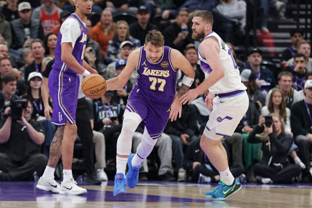 NBA常规赛,湖人143-135力擒爵士,本赛季连续3次战胜对手。单场143分也是湖人本赛季单场得分新高。此役,东契奇狂砍45分11篮板14助攻5抢断,詹姆斯揽下28分7篮板10助攻。 数据统计 湖人方面,东契奇45分11篮板14助攻5抢断,詹姆斯28分7篮板10助攻,八村塁13分3篮板,海斯16分3篮板,斯玛特17分4篮板。爵士方面,乔治34分4篮板8助攻,贝利19分4篮板,科利尔18分13助攻,努尔基奇15分8篮板7助攻。 背景介绍 该场对决,双方均有核心球员缺阵。爵士方面,队内球星马尔卡宁缺席,本赛季场均27.8分7篮板2.1助攻,是爵士队内头号得分手。湖人方面,里夫斯、艾顿纷纷缺阵,其中里夫斯赛季场均27.8分5.6篮板7.8助攻,艾顿赛季场均15.3分9篮板。不过,詹姆斯、东契奇均能够出战。本赛季常规赛,双方此前已有过2次交锋,湖人均取得胜利。 比赛进程 首节初始,爵士成为更早进入状态的球队,通过外线三分球、反击上篮及罚球轰出一波得分小高潮,建立起8分领先优势。东契奇、詹姆斯挺身而出为湖人连续取分,成功迫近分差。紧接着,爵士外线火力全开连续投中3记三分球,又一次拉大分差。东契奇再度率队追分,但湖人外线防守表现依旧欠佳,又被爵士连中三分球。首节战罢,爵士单节轰下41分且领先9分。次节,湖人唤回外线投射手感连中三分球轰出得分小高潮,瞬间将分差迫近到2分。不过,爵士迅速给予对手回击再度建立领先优势。节末,东契奇通过持球突破上篮与罚篮持续取分,率湖人紧追比分。半场结束时,湖人落后爵士5分,东契奇半场独揽25分4篮板8助攻3抢断且0失误。 易边再战,贝利开局阶段手感火热,不仅连续命中3记三分球且持球突破抛投也中,半节砍下11分,助爵士扩大分差,湖人被迫叫了暂停。暂停回来,东契奇又一次将球队扛在肩上,当东契奇打成2+1后助湖人将比分追为102-102平。但爵士节末连取4分,以106-102领先结束第三节。末节,詹姆斯携斯玛特连续摘分助湖人轰出一波15-4,扭转局势反超比分。而后,爵士连中三分球紧追比分,但东契奇随即接管比赛,先是打成2+1随即连中三分球,助湖人将领先优势扩大到两位数。尾声阶段,爵士尝试追分,但湖人成功守住胜局。 首发阵容 湖人:东契奇、詹姆斯、八村塁、斯玛特、海斯 爵士:乔治、贝利、努尔基奇、菲利波夫斯基、米哈伊柳克