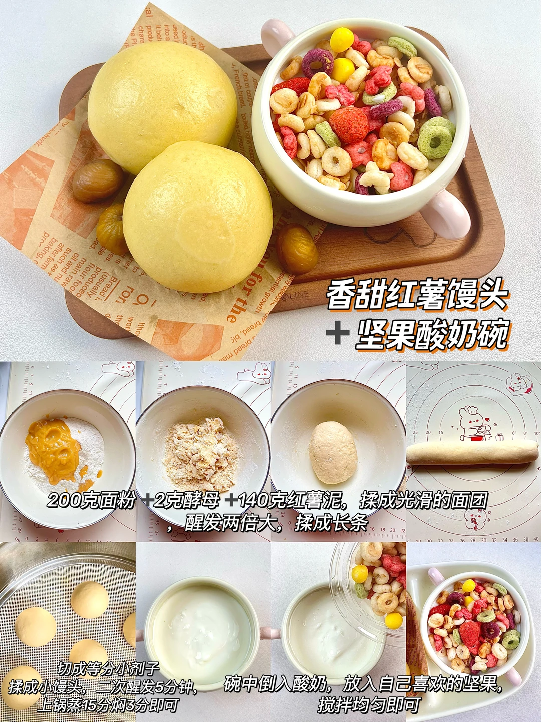 Hi 妈妈们好呀! 今天又来分享宝宝的营养快手早餐了🥰,简单好做,营养好吃,我家孩子每次都能吃光盘💿,宝宝吃饭香香,身体才能棒棒哒~赶紧一起学起来吧! 🔸香甜红薯馒头➕酸奶坚果碗 🔸红糖开花馒头➕羊肚菌鸡汤 🔸猪肉白菜煎饺➕米酒小汤圆 🔸培根芝士吐司➕香甜玉米羹 🔸家庭版蛋挞➕紫菜酸汤水饺 🔸菠菜酱肉包➕山药蒸肉丸 ✅具体做法参考图文教程哦~ 祝大家都能吃到香香,身体棒棒哒~