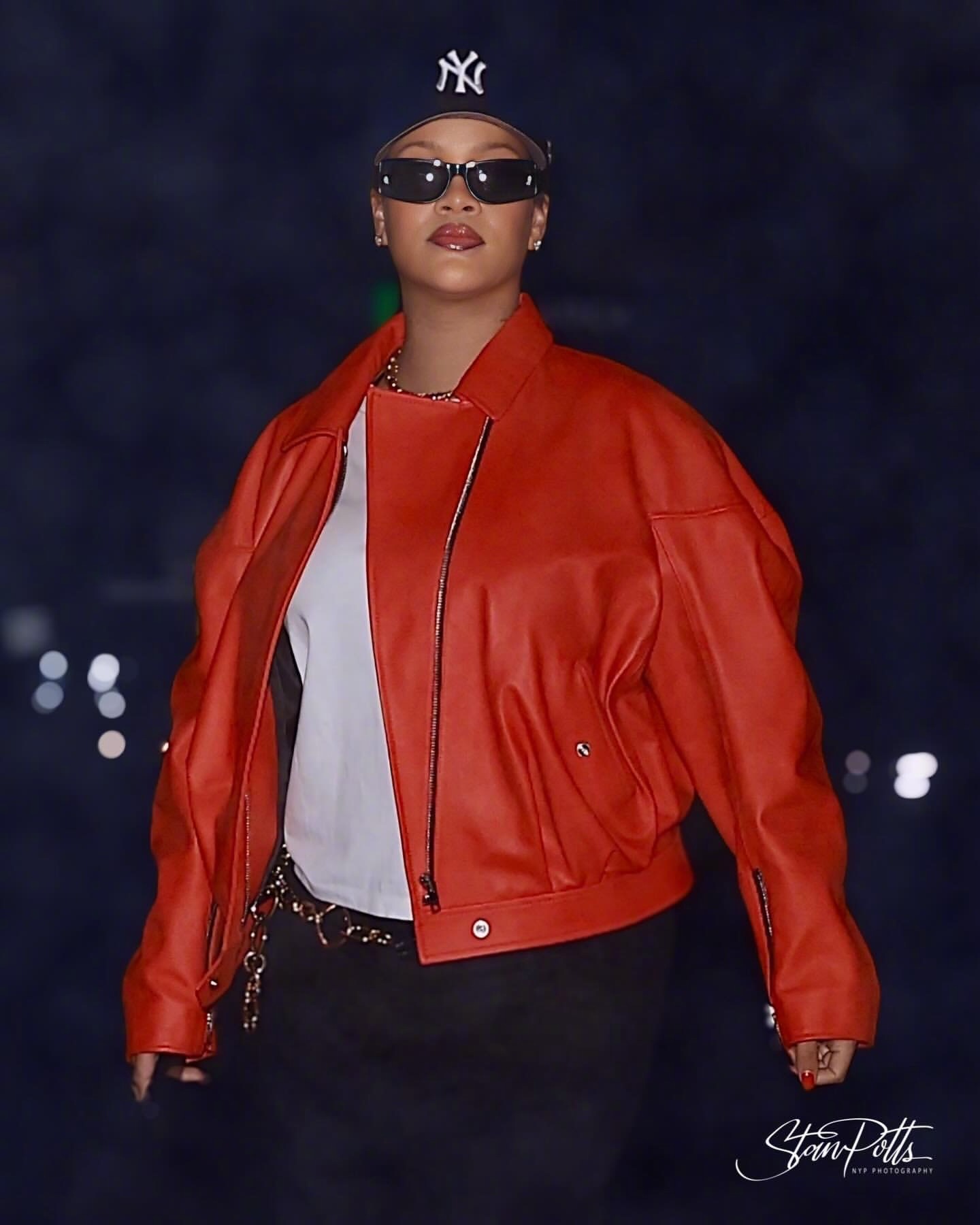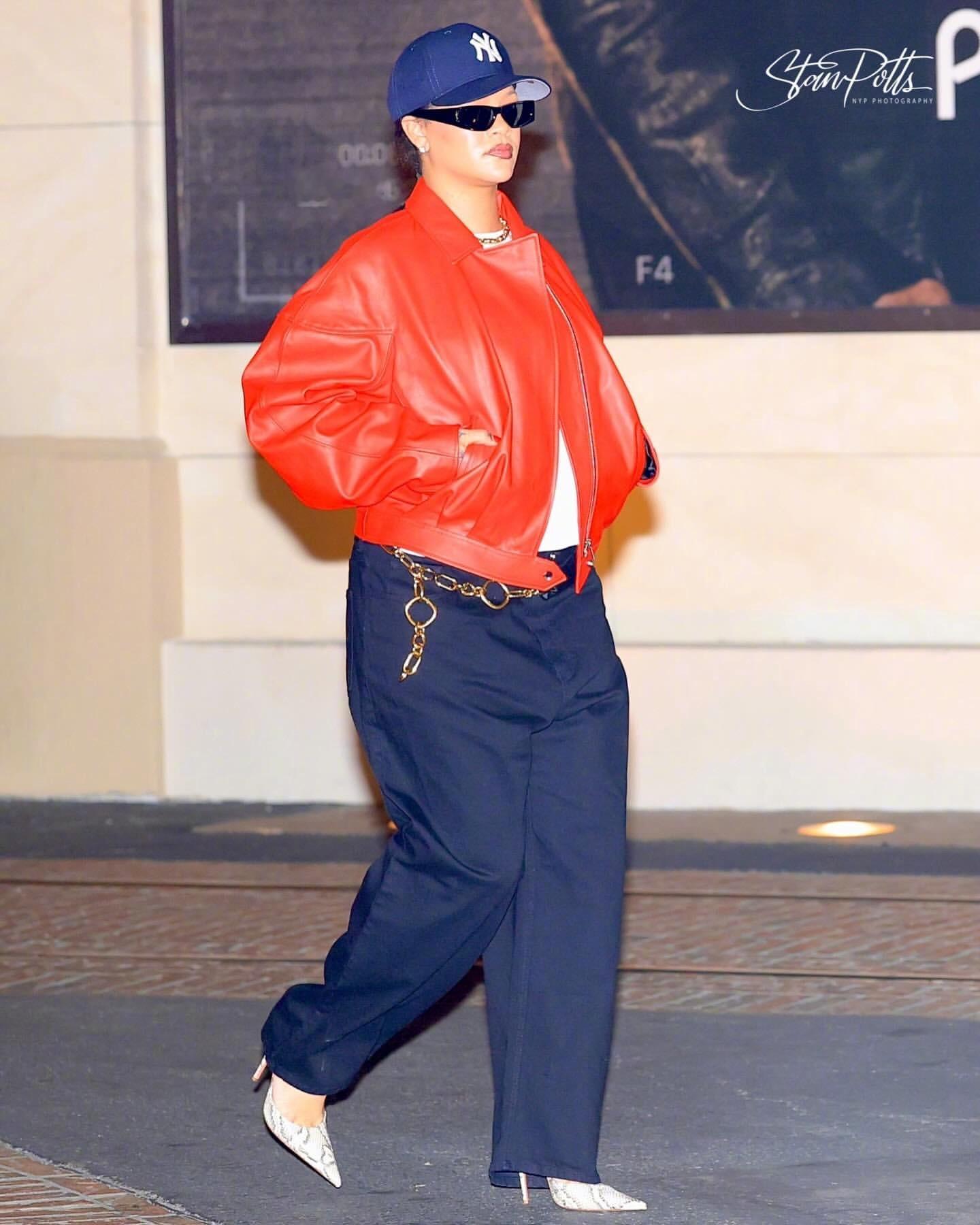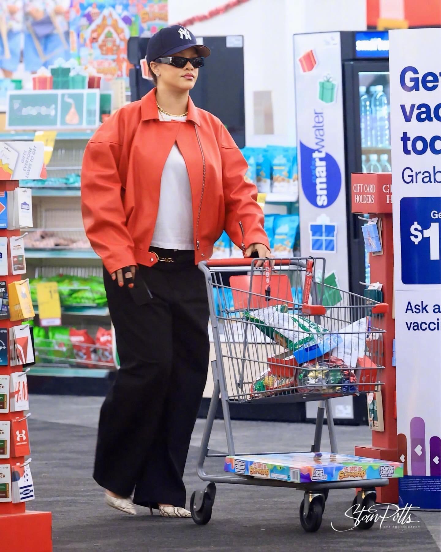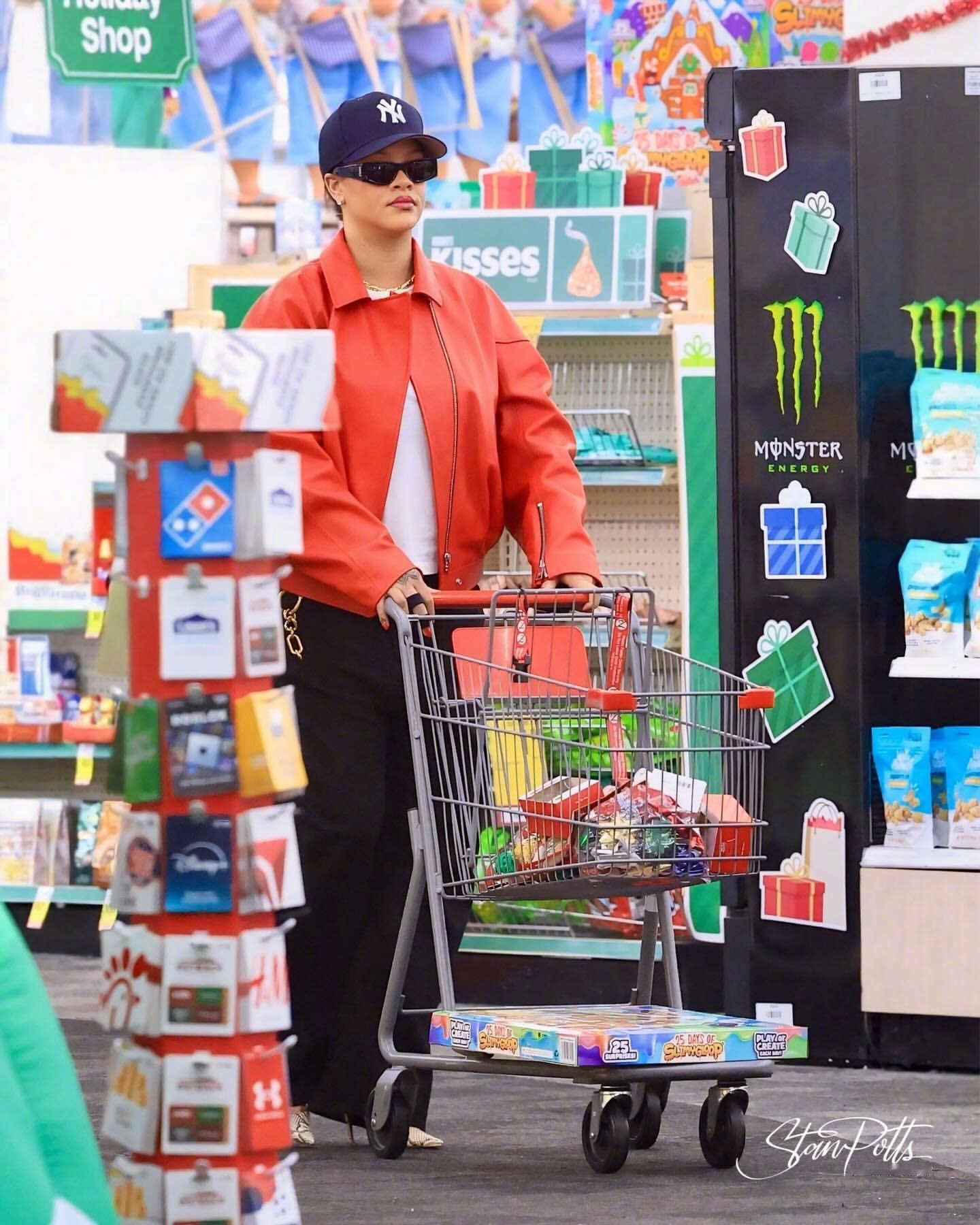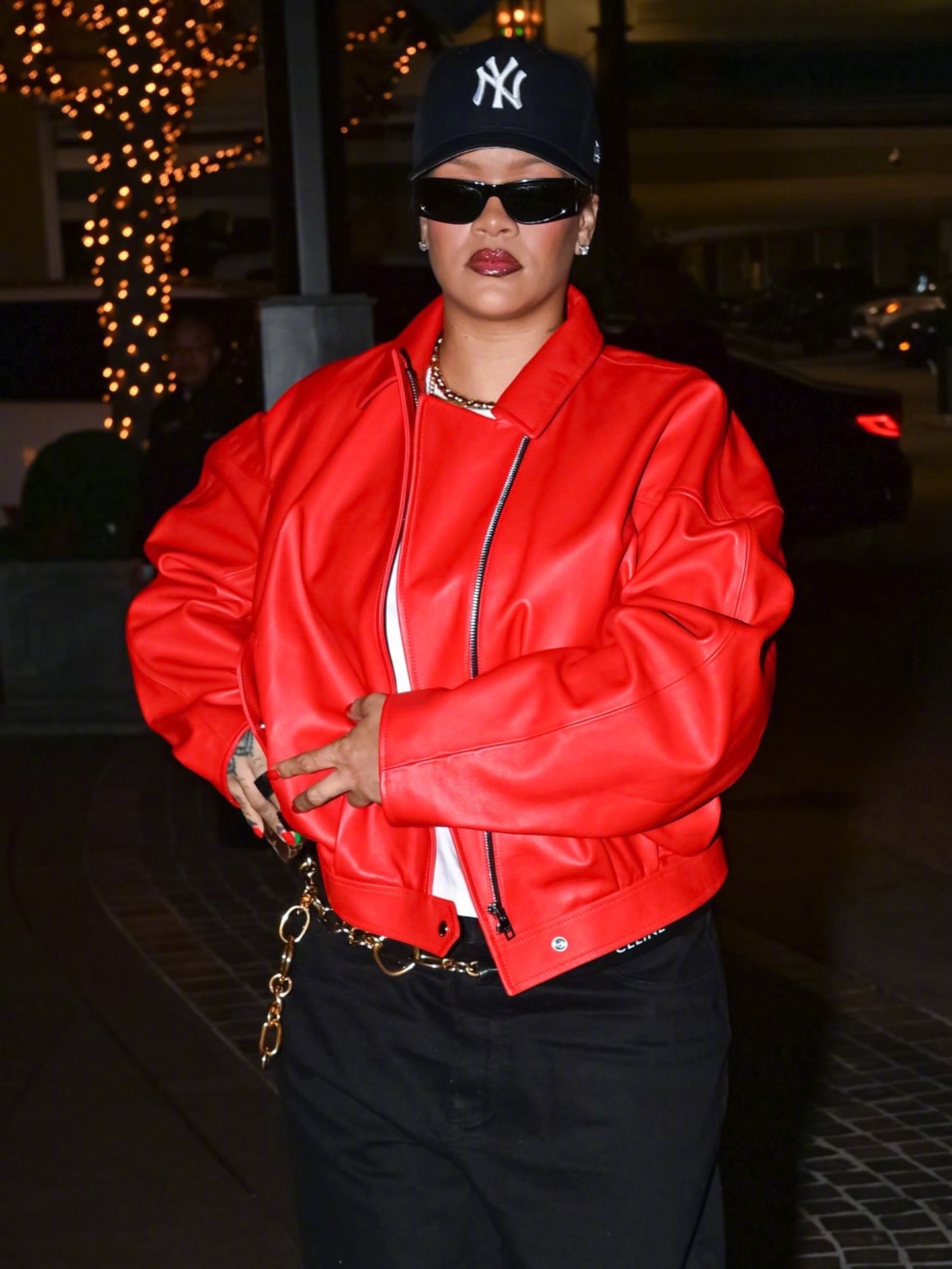 辣妈蕾哈娜 在西好莱坞购物被拍,还去了CVS药店。身穿Celine 红色夹克,下搭配黑色长裤,头戴一顶1947年纽约扬基队的棒球帽,佩戴金色粗链项链和几条叠戴的手链,很有圣诞气息的一身造型! 三胎产后恢复还很漫长,来一个全世界巡演应该就瘦了!米拉服饰解析