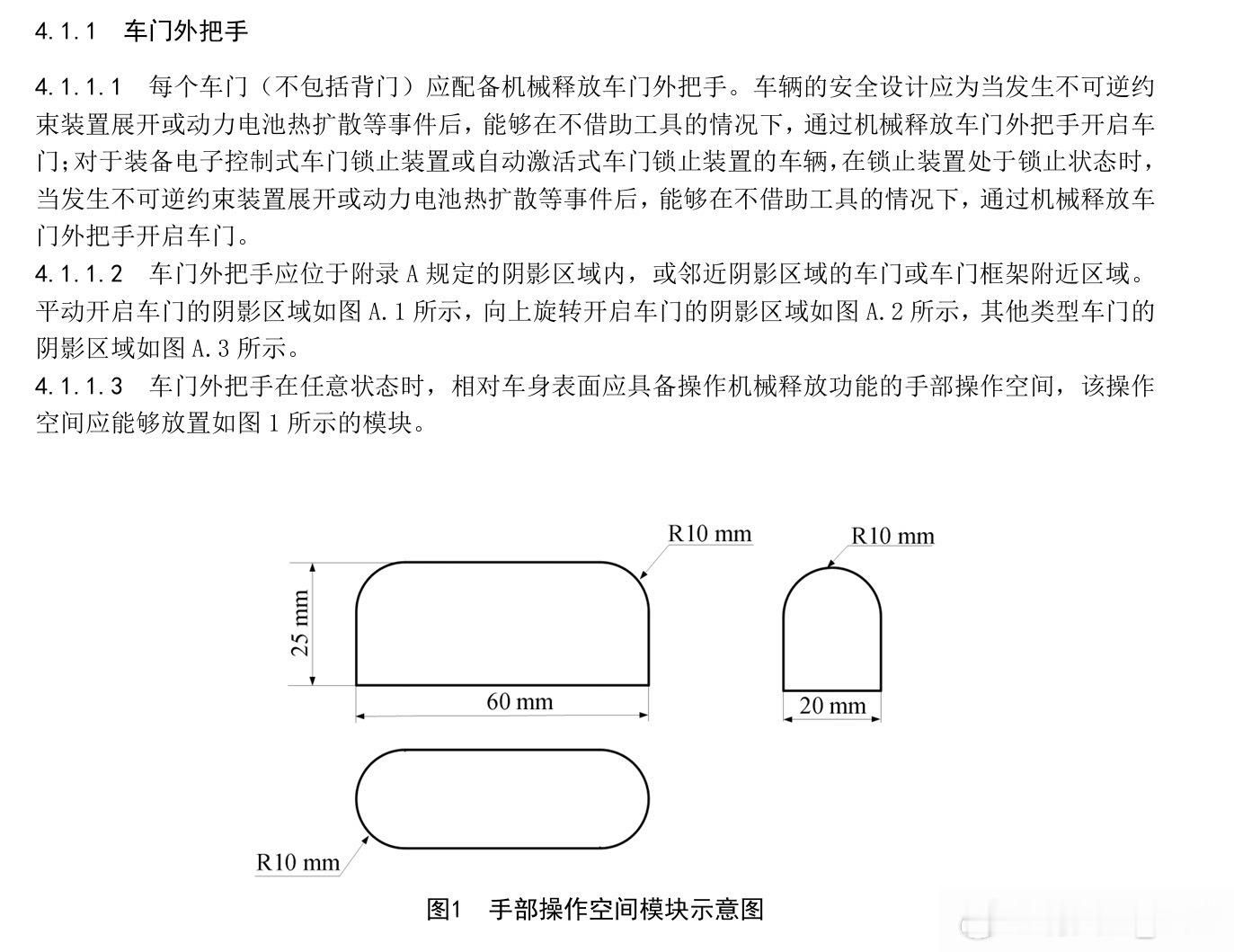 关于「门把手」的强制性国标来了!要求每个车门都应该配备机械释放门外把手,电池热失控的等事件后,能够不借助工具,通过门外把手开启车门。而且,不仅是新车,已经批准的老车也需要改,分别留了1-2年的整改时间。能纳入强制性国标的配置,都是关乎消费者行车安全的核心关键,开车出行,安全永远是第一位。汽车车外门把手应有手部操作空间 明确禁止全隐藏式门把手