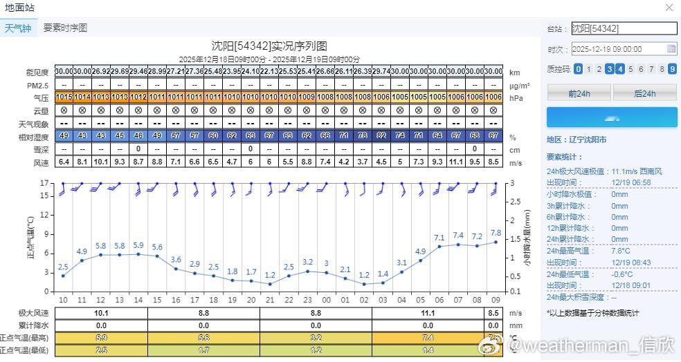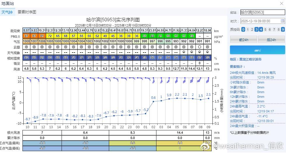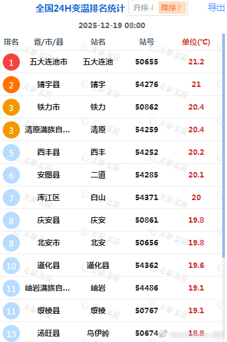 【东北气温猛升】今天8时对比昨天8时,东北气温大幅上升。今晨8时,黑龙江五大连池升21.2℃、吉林靖宇升21℃、辽宁清原升20.4℃,为三省升温最强站点。如此猛的升温,一个是因为有南风输送温暖的空气,一个是因为夜间有云层遮盖保温。哈尔滨、长春、沈阳在今天凌晨,气温均出现逆升,尤其是哈尔滨在凌晨1-2时,气温提升了5.8℃,说明暖平流很强。也因为气温猛升,哈尔滨今晨的降水,不是下雪而是下雨。哈尔滨12月下雨,也是相当少见,之前有过3次(1979-12-19、1997-12-26、2018-12-21)。