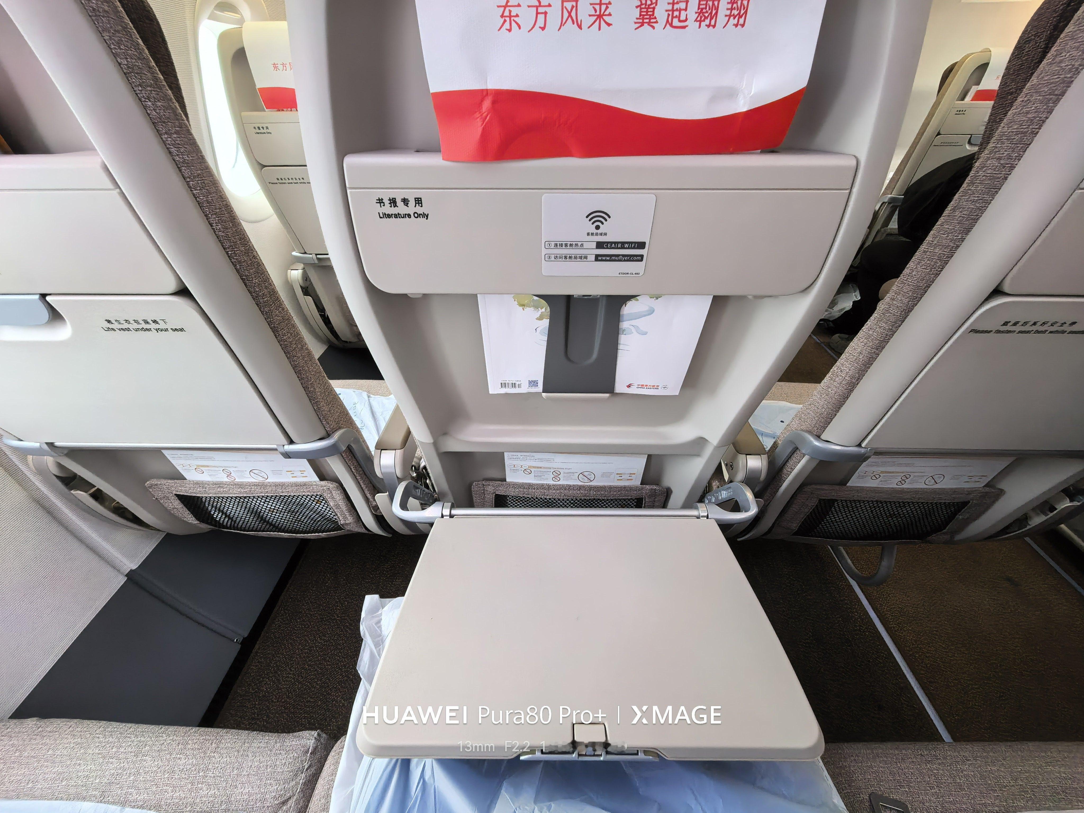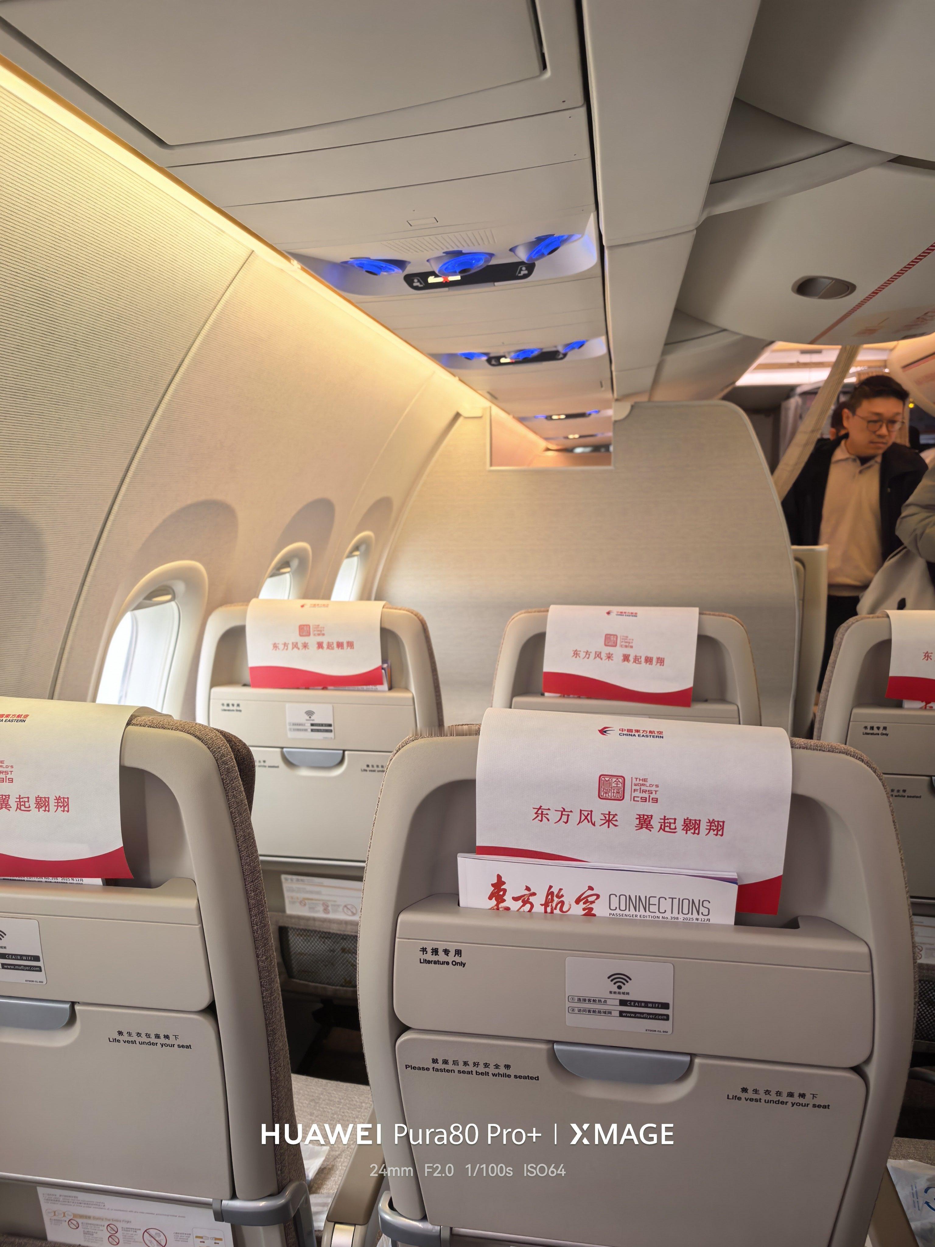 开心,坐上咱自己的大飞机 C919 了早就想体验了,这次专门跑天府机场来飞,但是这个飞机比我想象的小一些,座椅舒适度还行,经济舱个人空间中规中矩,但行李箱真的太小了,旅客坐满的话根本放不下,今天都是让我把软包放脚下,好在每个人都会送一个大号塑料袋用在装行李每个座位上默认都有毛毯,我期待下待会东航的午餐