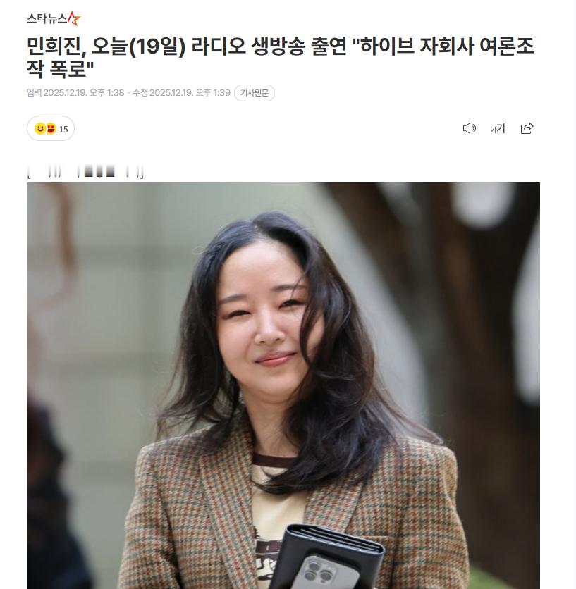 【闵熙珍今日(19日)出演电台直播节目,将揭露"HYBE子公司操纵舆论"】海外新鲜事 热点现场 前ADOR代表闵熙珍将于19日作为嘉宾,现身YTN电台《金俊宇的新闻正面交锋》直播节目,就围绕她本人的大型企业有组织操纵舆论的疑云以及今后的计划开口发声。闵熙珍将在本次节目中亲自提及通过近期美国法院诉讼过程而曝光的、与HYBE子公司'TAG PR'相关的令人震惊的真相。此外,闵熙珍还将在节目中提及,HYBE在近期的法庭攻防过程中,为何要将与事件本质无关的私生活牵扯进来,并给她套上"前恋人特殊待遇"的框架。此前,在18日举行的股东间合同相关诉讼中,HYBE方在法庭上甚至传唤了闵熙珍的前男友,提出过度支付劳务费及特殊待遇的疑云。闵熙珍则反驳称"这是将凭实力和结果证明的伙伴关系用私生活来歪曲的无理攻击"。闵熙珍表示:"与BANA的合作是成就NewJeans音乐性成功的战略性、经营性判断,将其与私人关系挂钩是对审判本质的混淆视听。"另一方面,闵熙珍还将在诉讼之外,谈及正在稳步推进的厂牌OOAK Records充满希望的未来。闵熙珍透露近况称:"目前,投资者、支持者等正饶有兴致地关注着我们的动向","我们有很多有趣的计划,甚至收到了与偶像无关的新领域项目的委托。"