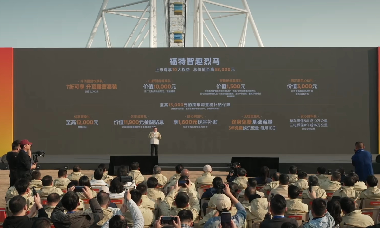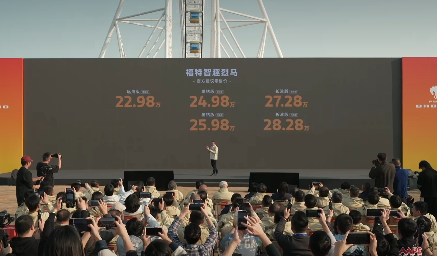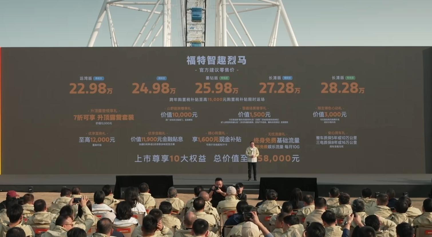 22.98-28.28万的智趣烈马还是很有竞争力的基础参数:5025*1960*1825mm,轴距:2950mm续航:220/650km发动机:1.5T电机功率:332kW电池:磷酸铁锂电池容量:43.7-105kWh零百加速:5.3s-5.8s悬架:钱双叉臂/后五连杆接近角/离去角:30/31°/32°(增程)涉水深度:600mm智驾硬件:毫米波*3-5/超声波*12/辅助镜头*5-11智驾:福特福域辅助驾驶系统车机芯片:高通8255屏幕:15.6中控+8.8液晶仪表+70 AR-HUD车身颜色:灰/绿/白/黑/蓝/橙内饰:灰/绿后备厢:497L轮毂:19寸座椅:真皮辷+前排电动+通风加热其他配置:全尺寸外挂备胎/玻璃天幕/电动升顶/自动大灯/21扬声器/540影像25.98万 墨钻纯电版对开中央扶手/仿皮座椅/电动座椅28.28长滩纯电版激光雷达*1+Orin X*2/高速领航/记忆泊车电尾门/副驾腰托+按摩/后排加热/冷暖冰箱22.98万 远湾增程版8扬声器/ACC24.98万 墨钻增程版70AR-HUD/7.1声道+21扬蠕行模式/后排电调/一键大床小息模式/真皮方向盘/27.28万 长滩增程版激光雷达*1+Orin X*2/高速领航/记忆泊车前后差速锁/电尾门/副驾腰托+按摩/冰箱/选装:一键升顶露营套装(前排头枕自动翻)黑色车顶选装包置换礼:12000元教授觉得福特这波的诚意还是很高的,最低22.98万,续航220km的续航,拿去越野完全是够用了。增程里面24.98万的配置就基本齐了。纯电的话,直接25.98万的配置就OK了。教授觉得纯电版没那么划算,毕竟顶配才给齐配置,25.98的价位又是对应中配的,所以这台车,主打的还是增程的配置了。福特智趣烈马智趣烈马福特