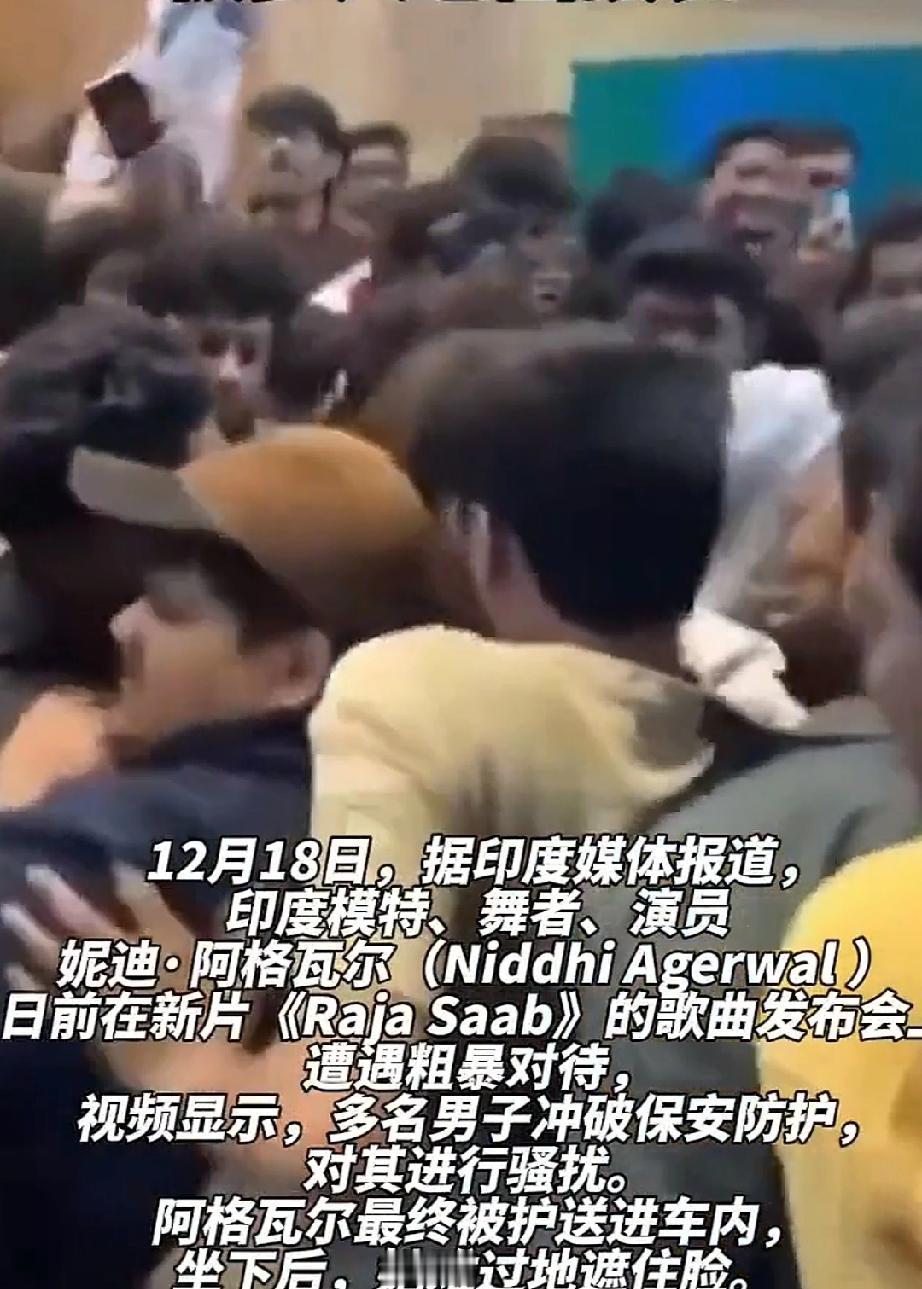 12月18日,印度模特、舞者、演员妮迪•阿格至瓦尔出席新片《Raja Saab》歌曲发布会。活动结束后,妮迪由保镖护送离开会场。 现场的很多“男性粉丝”将妮迪团团围住,冲破保安防护,伸出咸猪手骚扰。 安保人员费了好大劲,才将她送到车内。 妮迪总算是摆脱了骚扰,靠在车座,长长的舒了一口气。但是,围在车窗外那些“粉丝”,像饿狼一样盯着她,这让她太胆颤心惊了,不敢目视。妮迪用手蒙住了眼睛,只盼着快点离开,一刻也不想呆在这里。