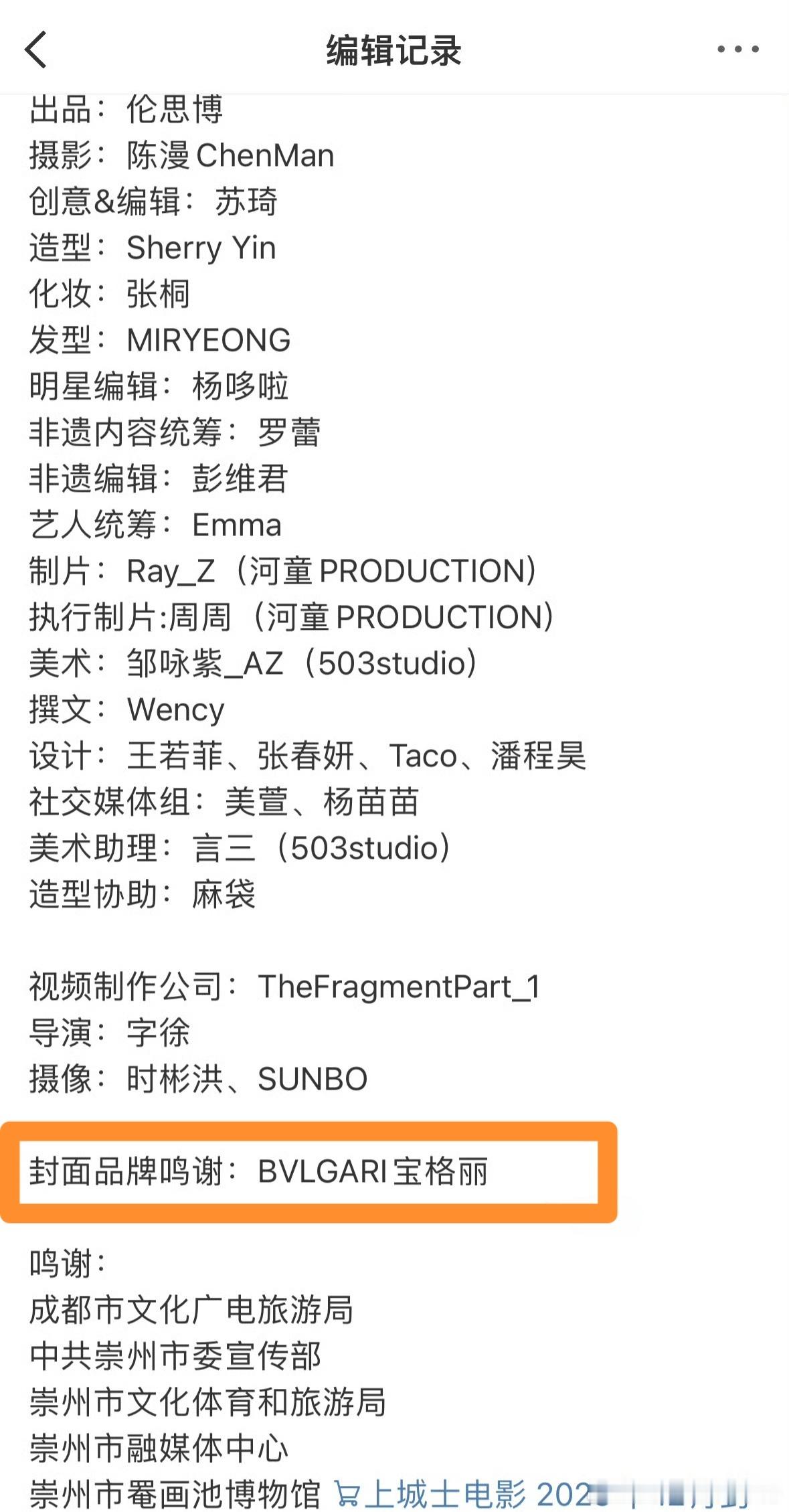 上城士官博把赵露思封面里品牌鸣谢的宝格丽艾特改成文字标注了