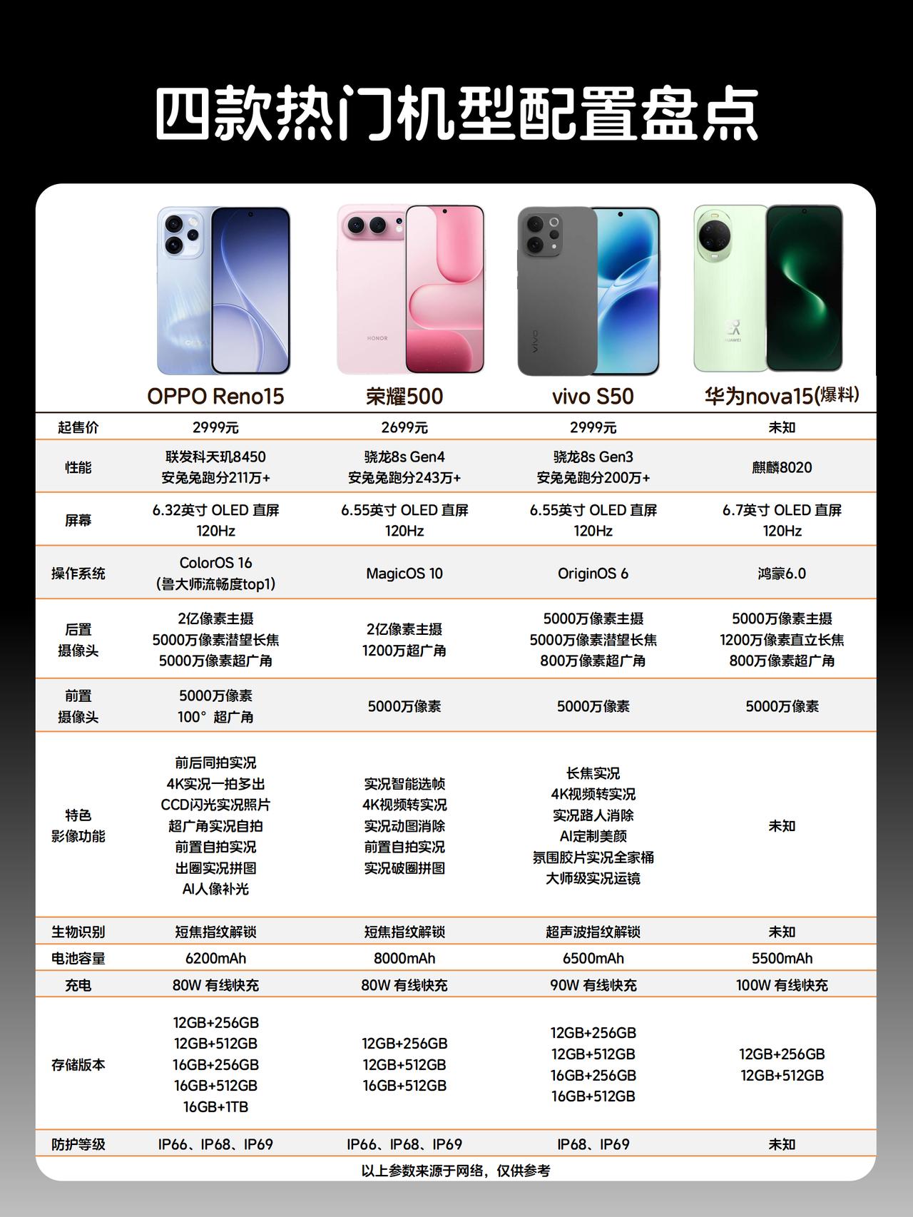 中高端手机性能天梯图,你的在哪个段位? 网友整理的3K档位手机性能天梯榜,榜单是根据安兔兔跑分来算的,参考价值还是挺高的,大家的手机上榜了没? 近期发布的几款中端新机也可以按这个榜单来看,OPPO Reno15是天玑8450,荣耀500是骁龙8s Gen4,vivo S30是骁龙8s Gen3,所以性能这块是荣耀和OPPO会有优势一点。 比如按照安兔兔公布的跑分来看,Reno15的天玑8450为211万+分,S50是200万+分。 当然了,买手机不能只看性能,其它配置也得注意~ 像拍照这块,荣耀500是2亿主摄+超广角的双摄组合,够用了。vivo S50则上到了三摄,带5000万潜望长焦。OPPO Reno15是相机配置更厚道,三摄不仅有潜望长焦,2亿像素主摄也安排上了,而且实况功能玩法更多,适合喜欢拍照的。 具体参数可以看看图2,你会怎么选呢? 以上纯属个人感受,仅供参考~