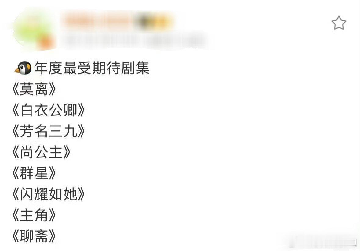 🐧2026年度最受期待剧集,你最期待哪部剧?《莫离》白鹿 丞磊《白衣公卿》龚俊 王玉雯《芳名三九》宋佳 高伟光《尚公主》孟子义 李昀锐《群星》张新成 万茜《闪耀如她》秦岚 王阳《主角》张嘉益 刘浩存《聊斋》张淼怡 常华森