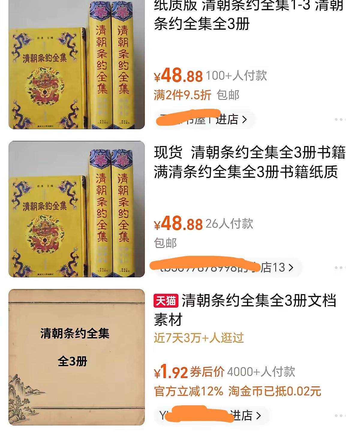 《清朝条约全集》纸质版居然又可以卖了! 这件事情应该算是典型的偷鸡不成蚀把米,本来现在纸质书就不好卖,何况这种历史文件平时不可能很多人关注,你说人家愿意卖就让他们卖吧,偏偏就有人找借口去举报下架,结果就是给书打了一个免费的广告。一下子搞的世人皆知。 书价也不贵,我都要入手一套,不为别的,就为了警醒自己不要忘记历史。