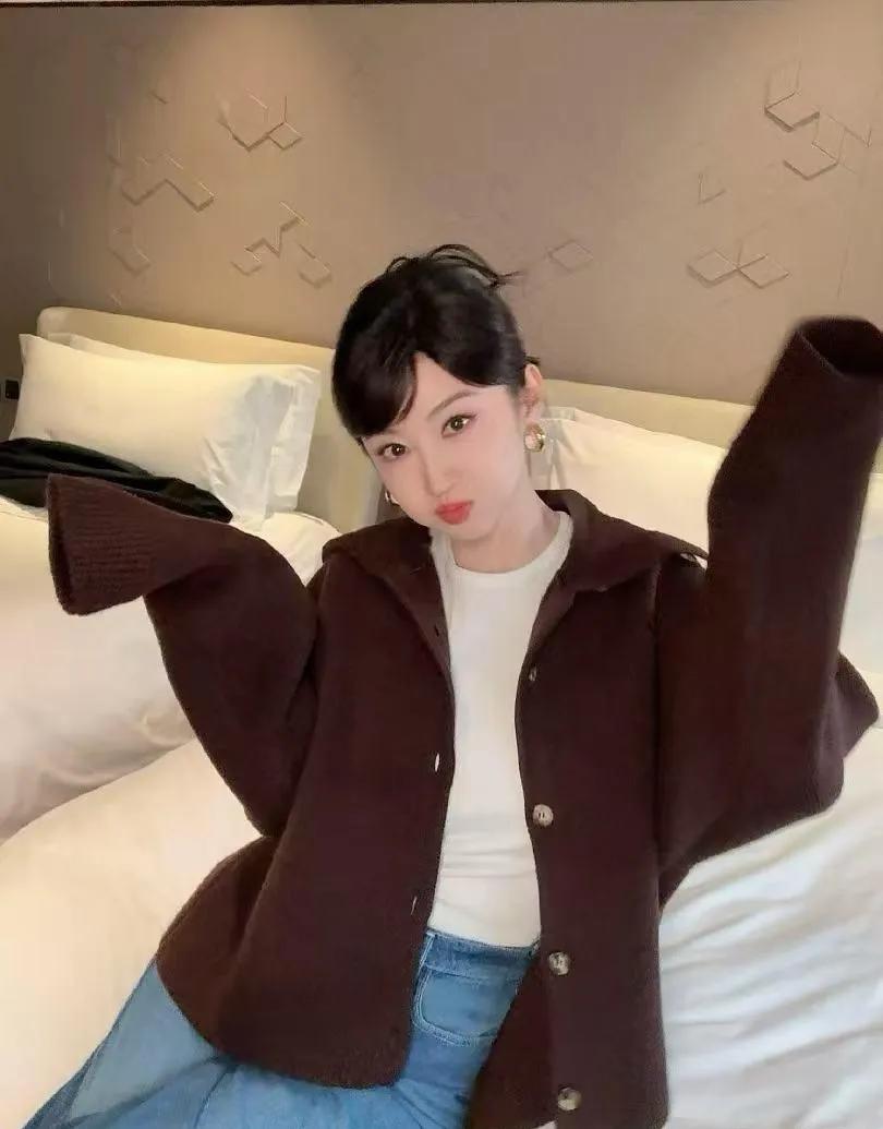 景甜私服赢麻了! 棕色针织外套搭白T+牛仔裤,简约又高级,甜妹的日常穿搭也太会了✨ 景甜私服 棕色系穿搭