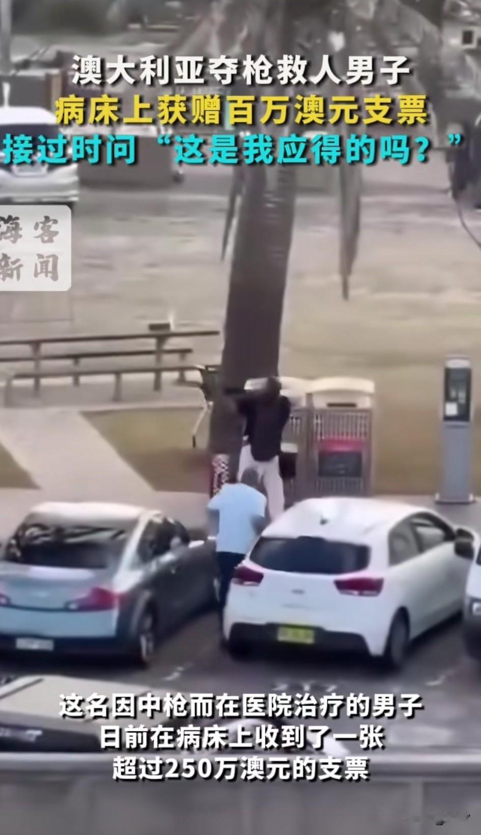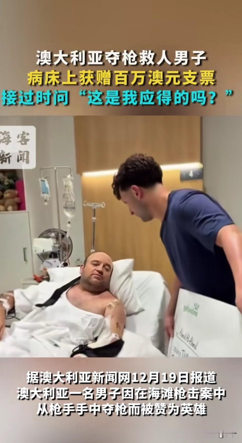 前段时间澳洲父子在海滩上, 随意猎杀犹太人, 被一个商户抢了枪, 商户中枪受伤, 如今躺在病床上面, 有志愿者上前看望他, 给他送了一张百万元的钞票, 表示是很多人感谢他的, 这位救人的大哥说了句是我应得的吗? 满脸不敢相信, 这就叫做见义勇为有好报, 因为受伤也不少花钱, 但是这些被他救的人, 别人通报给他凑了100万美元, 还是非常有良心的, 大哥正义的行为被当地很多人报道, 因此也受到了很高的关注, 这事也应该被大肆宣传, 这样才能让更多的人毫无顾忌见义为, 毕竟澳洲两父子是违法行为, 大家对于澳洲救人男子获赠百万美元支票怎么看? 澳洲枪击案 澳洲枪击案 澳洲暴力事件 澳洲枪击 澳洲华人遇袭 魔鬼犹太人 德国打犹太人