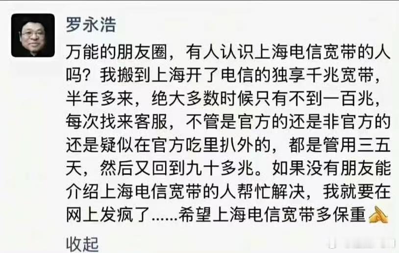 罗永浩痛批电信宽带缩水 吐槽宽带缩水没问题,但是最后一句说人家多保重是什么意思?是一种网络威胁吗?