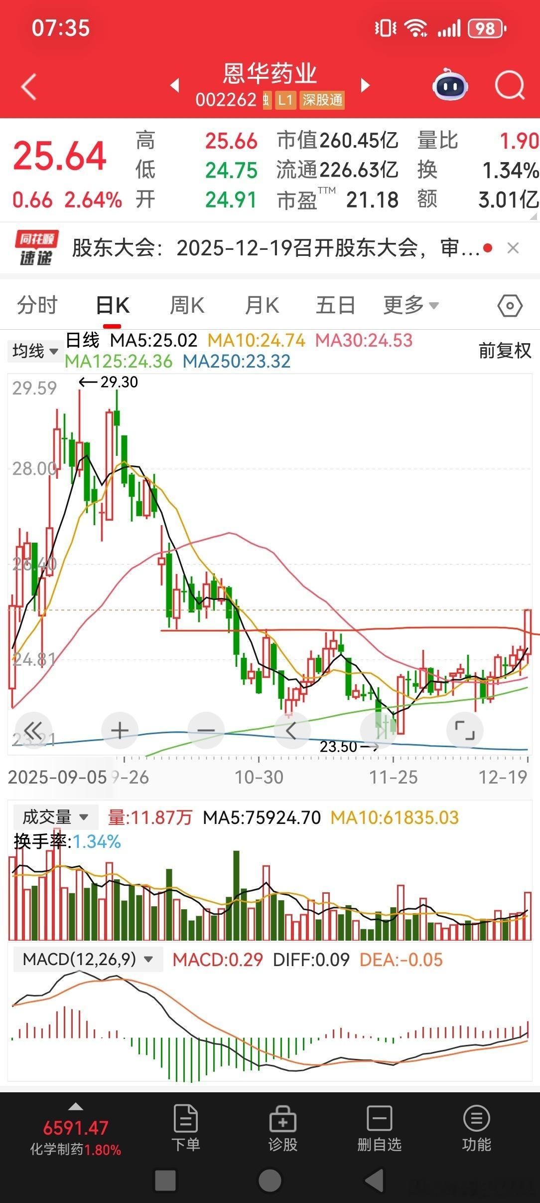 2025/12/19恩华药业三重底,温和放量,突破均线,太完美了,像一个陷阱。