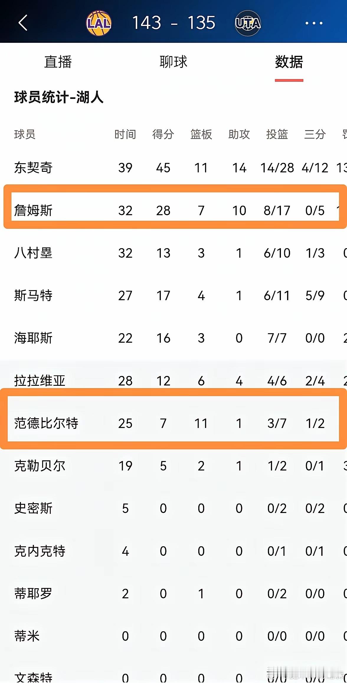 湖人大将范德比尔特真是球队的替补奇兵!在今天湖人客场以143:135战胜爵士的比赛中,范德比尔特替补出战25分钟,投篮7中3,其中三分球2中1得到7分11篮板,他的场上正负值为+15。值得一提的是,此役范德比尔特拼抢到了5个前场篮板,他的前场篮板数高居全队第一。雷迪克你可长点心吧多多用用彪哥