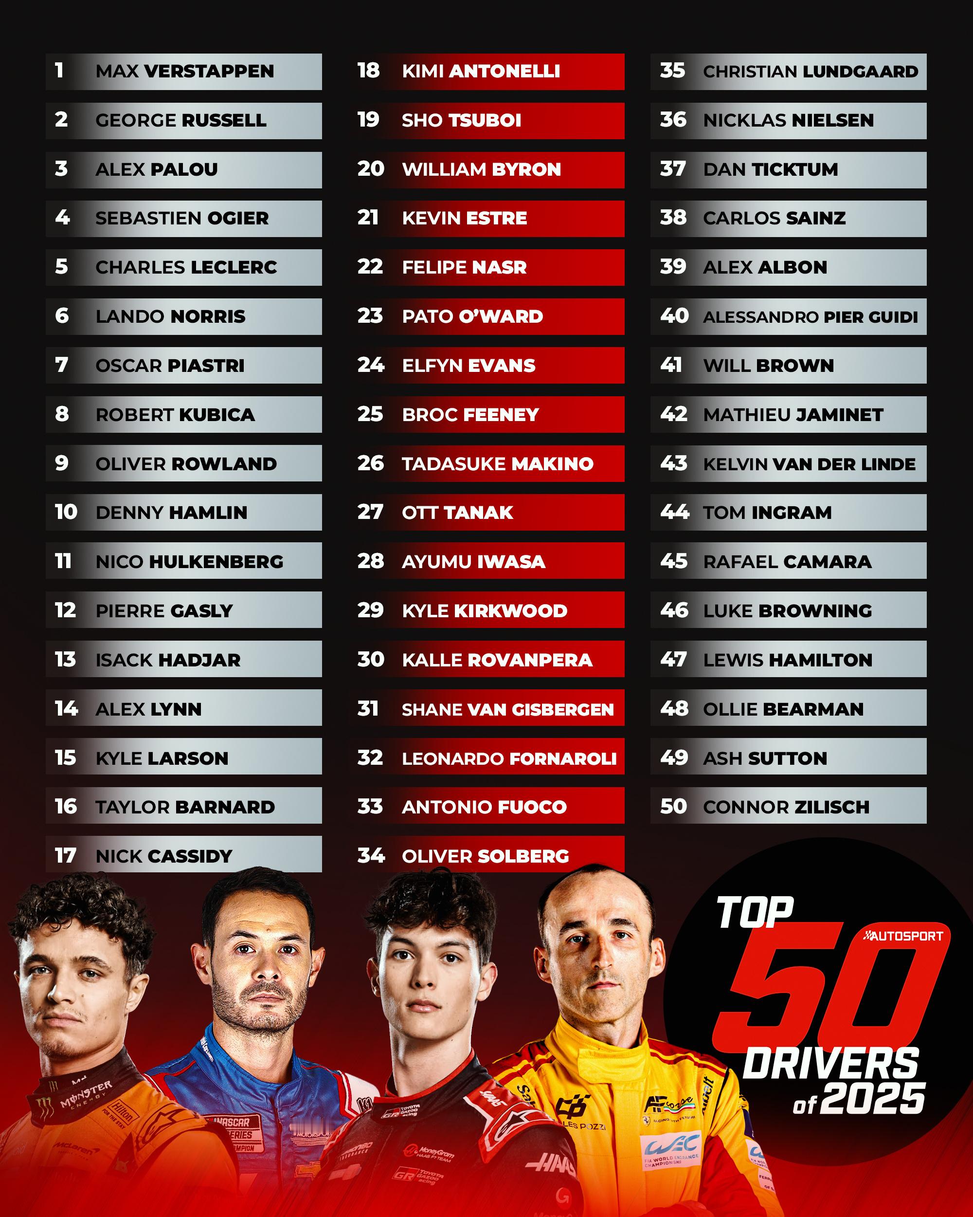 Autosport公布了2025赛季50大车手前十排名(详情见图二)1、维斯塔潘