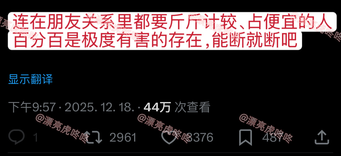 【twi】“连在朋友关系里都要斤斤计较、占便宜的人,百分百是极度有害的存在,能断就断吧”