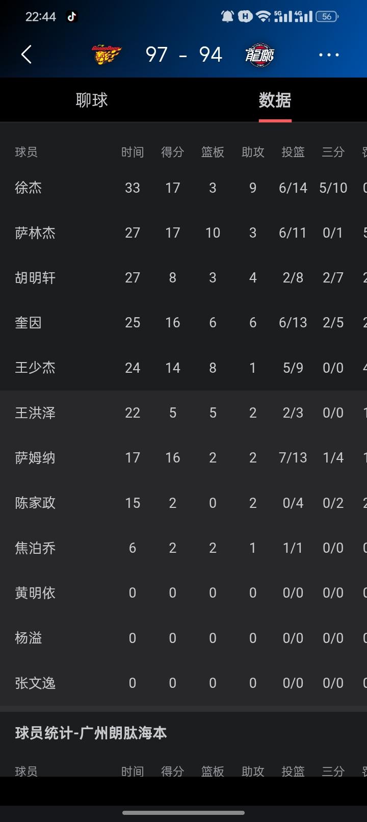 友谊第一! 比赛第二是! 广东德比,广东宏远以3分战胜广州龙狮,豪取三连胜!看数据,看看谁才是广东赢球的关键先生! 本场比赛,徐杰又创造了一个记录,连续两场都是整个广东队上场时间最多的球员,这场他拿到了17分,成为广东队5人上双的其中一位! 胡明轩的表示依然比较低迷,感觉现在他得分超过两位数都有点难度,真的是需要尽快调整啊!宏远男篮 广东男篮 广东宏远CBA
