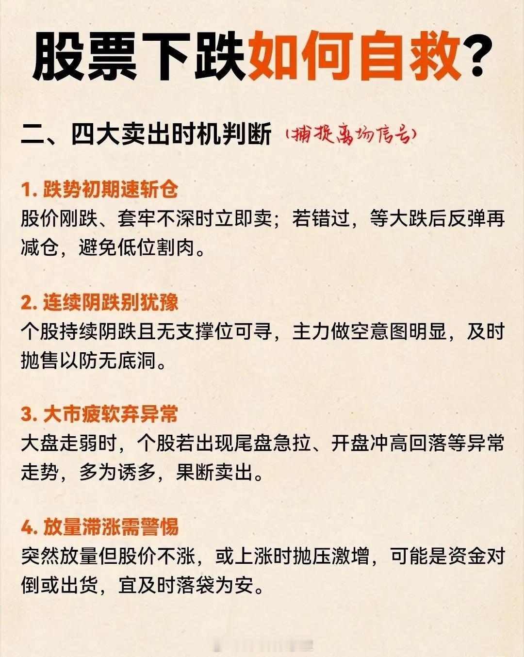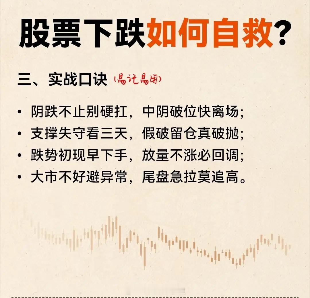股票下跌如何自救?三大策略助你从容应对在股票投资中,市场波动难以避免,当账户出现浮亏甚至大幅下跌时,盲目坚守或慌乱抛售都可能扩大损失。结合实战经验与经典策略,本文从卖出原则、时机判断、实战口诀三个维度,梳理出一套清晰的“下跌自救指南”,助你在震荡市中守住本金、理性决策。一、四大卖出核心原则:果断止损,拒绝侥幸下跌初期的每一次犹豫,都可能让亏损从“可控”变为“失控”。以下四条原则需刻入投资思维:1. 主动杀跌立即抛:若个股连续阴跌且伴随主力刻意做空(如突发利空后的连续跌停),杀跌空间往往超出预期。此时切忌抱有“等反弹”的侥幸心理——曾有案例显示,某股因突发利空连续跌停,早卖者比晚卖者少亏30%,果断清仓是避免深度套牢的第一步。2. 中阴破位快止损:单日跌幅超4%且无反弹迹象时,需“壮士断腕”。例如某股在高位放量下跌5%后,次日继续下探,若未及时止损,后续可能陷入“越套越深”的循环,及时离场能锁定剩余本金。3. 支撑破位辨真假:关键支撑位(如均线、前低)被跌破时,别急着割肉——先观察3日:若3日内未收复,说明是真破位,需立即卖出;若破位后快速反弹且伴随放量,则是假破位,可暂时持股观望。4. 趋势初现早离场:下跌趋势形成初期(如跌破上升通道下沿),要果断斩仓;若已大跌,不必急于低位割肉,可等待反弹至阻力位(如均线、前期缺口)再减仓,减少“割在地板上”的损失。二、四大卖出时机判断:捕捉离场信号除了原则指引,还需学会识别具体的卖出时机,避免“该卖时没卖,不该卖时乱卖”:1. 跌势初期速斩仓:股价刚下跌、套牢不深时,应立即卖出——此时止损成本最低;若错过初期时机,等大跌后反弹至阻力位再减仓,总好过在低位恐慌割肉。2. 连续阴跌别犹豫:个股持续阴跌且无明确支撑位(如均线、平台),往往是主力悄悄出货的信号,如同“温水煮青蛙”,越犹豫亏损越难挽回。3. 大市疲软弃异常:大盘走弱时,个股若出现尾盘急拉、开盘冲高回落等异常走势,多为“诱多陷阱”——主力借大盘弱势制造反弹假象吸引接盘,此时果断卖出才是明智之举。4. 放量滞涨需警惕:突然放量但股价不涨,或上涨时抛压激增(如卖盘挂单密集),可能是资金对倒出货或主力撤离,此时“落袋为安”远胜于幻想“再涨一点”。三、实战口诀:易记易用的“保命法则”将复杂策略浓缩为口诀,才能在瞬息万变的市场中快速反应:- 阴跌不止别硬扛,中阴破位快离场;- 支撑失守看三天,假破留仓真破抛;- 跌势初现早下手,放量不涨必回调;- 大市不好避异常,尾盘急拉莫追高。结语:下跌不是终点,而是认知的试金石股票下跌并不可怕,可怕的是没有应对之策。真正的“自救”,从来不是追求“买在最低、卖在最高”,而是通过果断止损的原则、精准识别的时机、朗朗上口的口诀,把亏损控制在可承受范围内。记住:投资的核心是“活下来”,只有守住本金,才有机会参与下一次行情。当你学会与下跌“和解”,便已在投资的路上走得更稳更远。