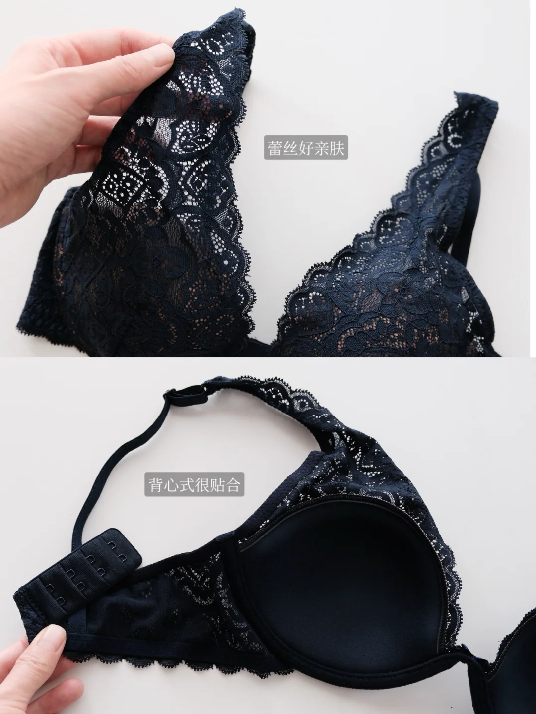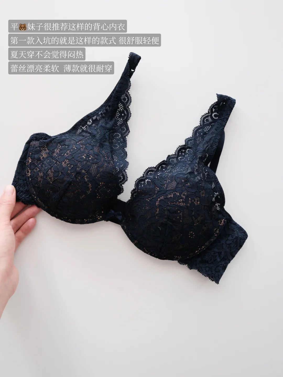 轻薄贴肤的蕾丝款bra,很贴身。面料不太会扎并且很柔软,穿起来不会勒也不移位,不会出现空杯的问题🥳