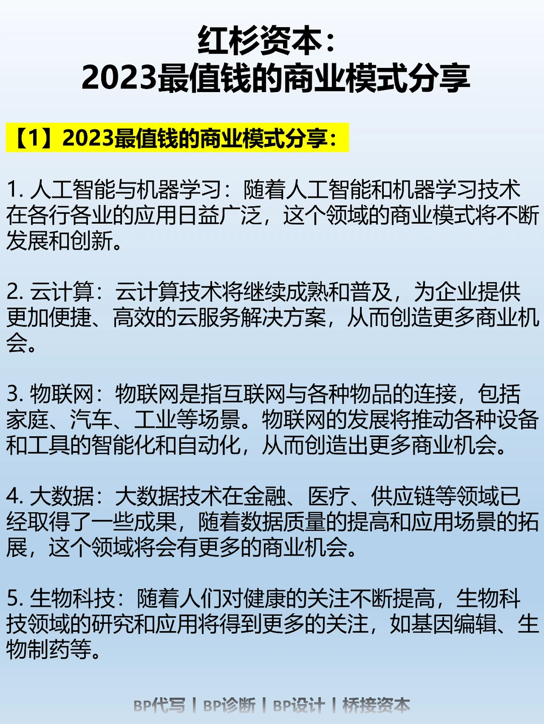 4. 大数据:大数据技术在金融、医疗、供应链等领域已经取得了一些成果,随着数据质量的提高和应用场景的拓展,这个领域将会有更多的商业机会。