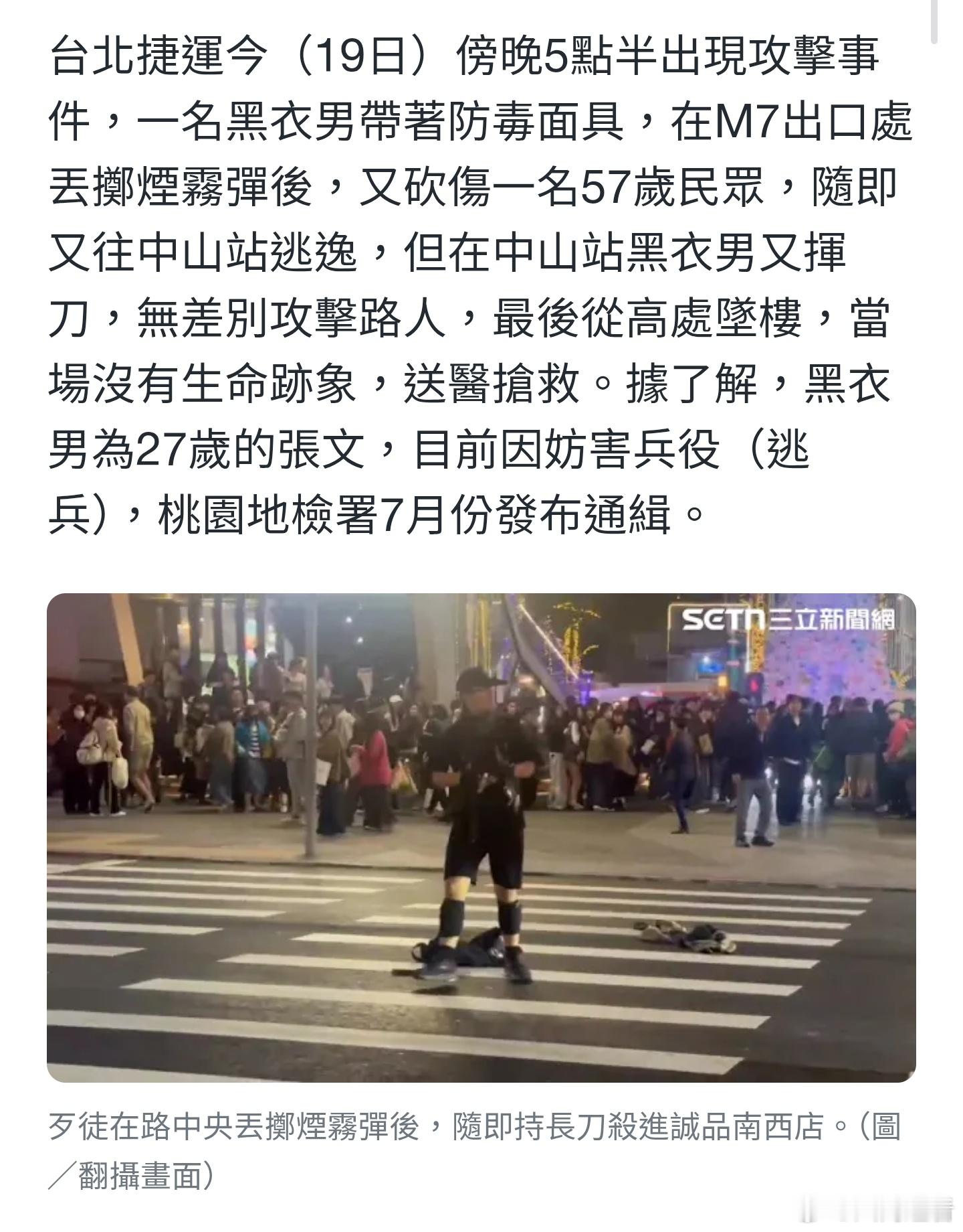台北车站袭击案嫌犯坠楼据了解,黑衣男为27岁的张文,目前因妨害兵役(逃兵),桃园地检署7月份发布通缉。他现在跳楼了,伤势危急,正在抢救中我的观点不设限