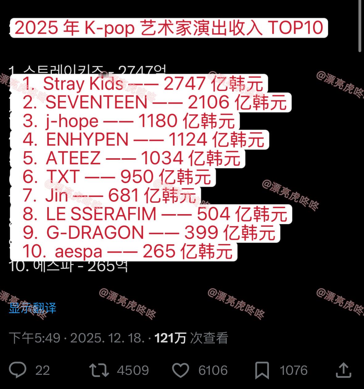 【twi】2025 年 K-pop 艺术家演出收入 TOP10